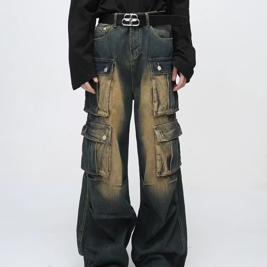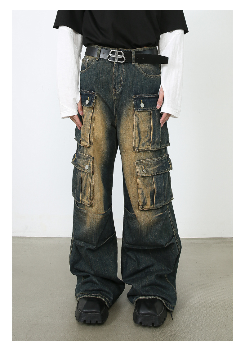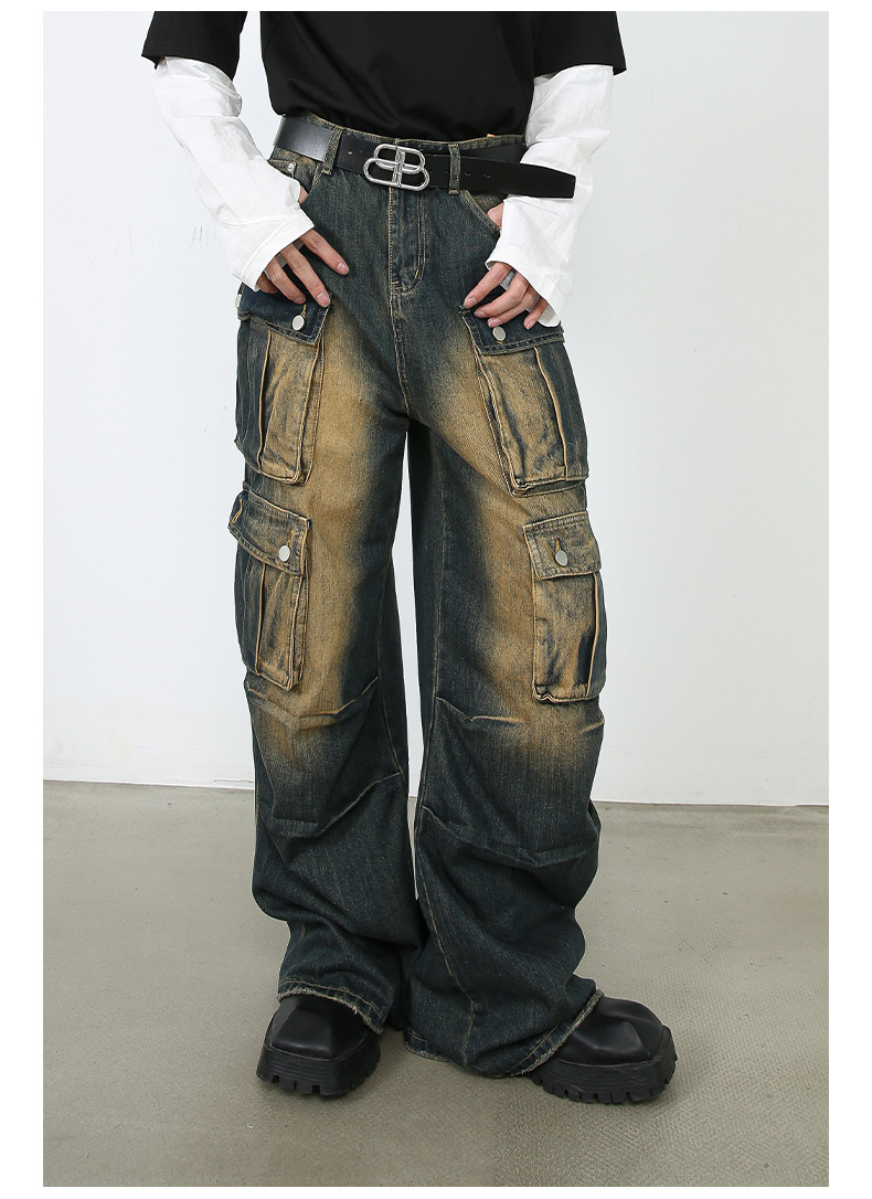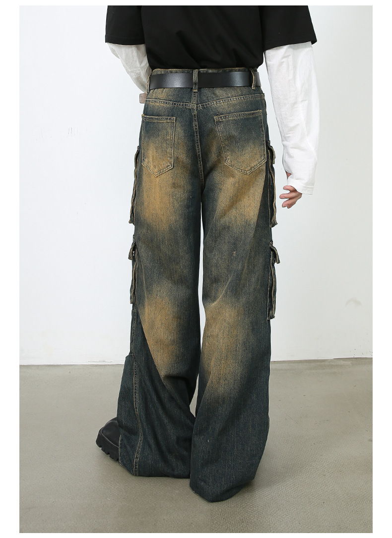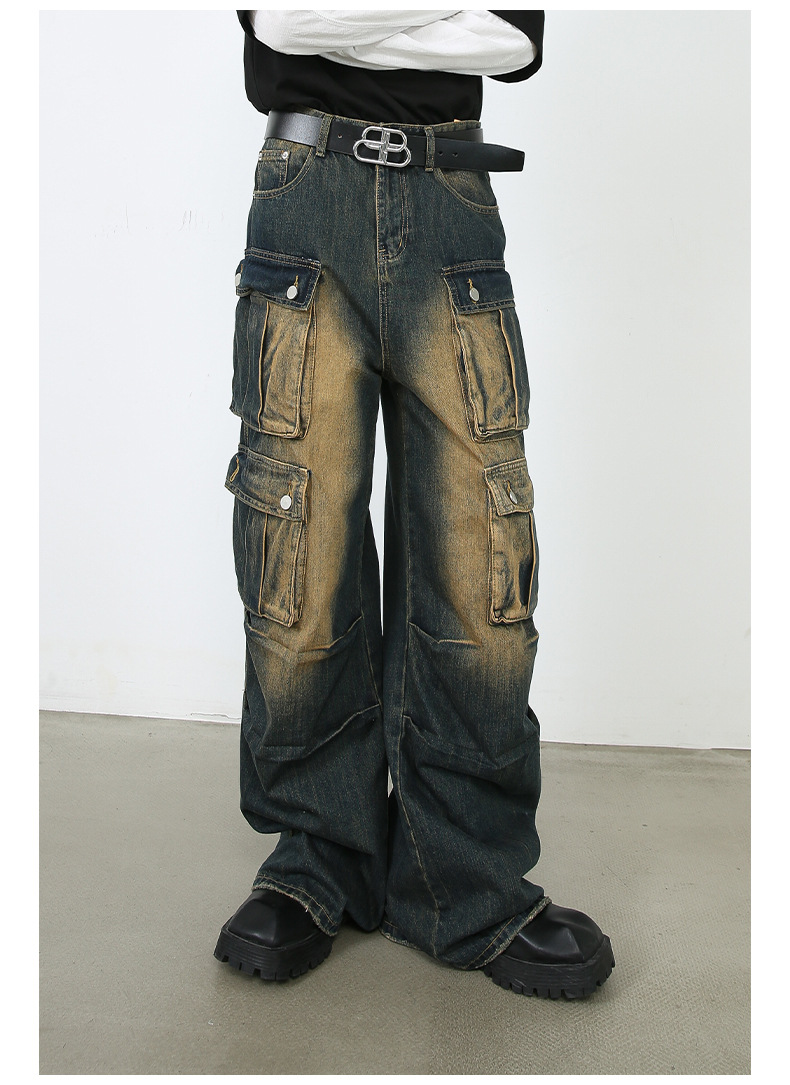 美式复古多口袋复古阔腿牛仔裤男春季宽松街头hiphop嘻哈直筒裤子