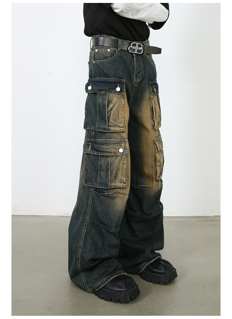 Nirbenカウボーイ | アメリカのレトロな多ポケット水洗いジーンズ男高街ゆるい直筒工装ズボン