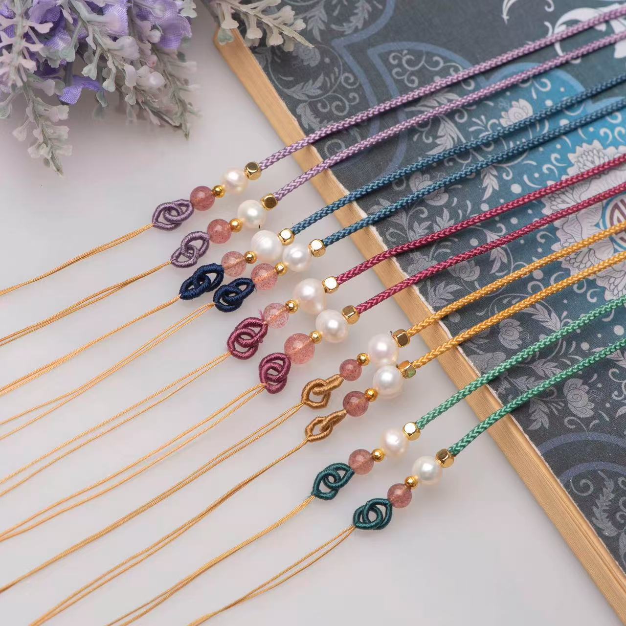 半製品のネックレスの紐は手作業で玉の輪のペンダントを編みます。