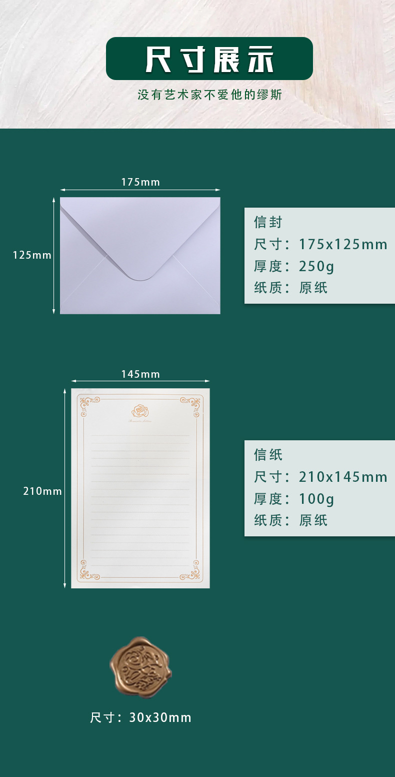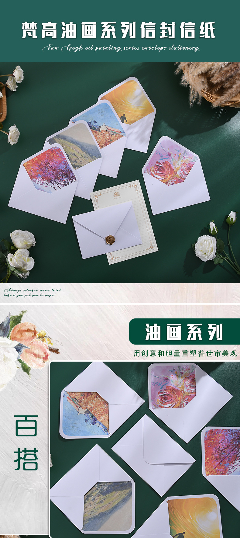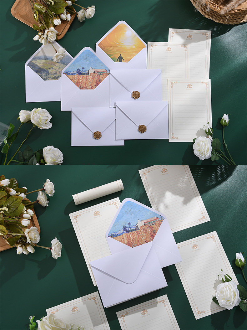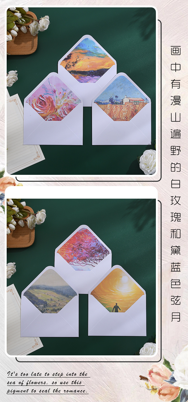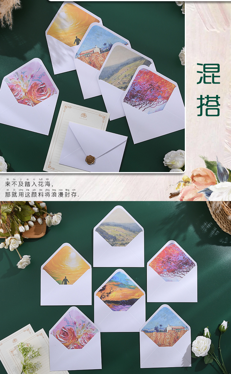サイズ 抽象バラ封筒1個,幻樹封筒1個,静かな山間封筒1個,秋色田園封筒1個,ラベンダー海洋封筒1個,光を追う人封筒1個,A5ローズレター1枚,For you火漆章1個,白い油絵の6つの封筒が混ざっています。