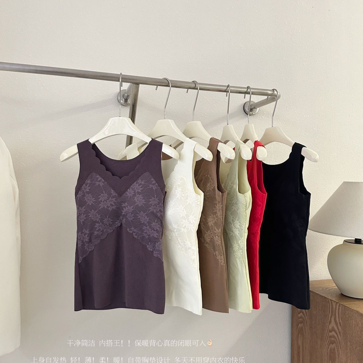 38600糸のベルベット固定カップ付き保温レースベスト、Vネック、胸パッド入り、インナーにもアウターにも着用可能、女性用ベースレイヤー、工場直販