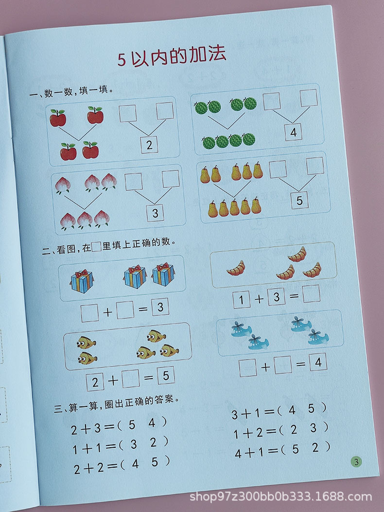幼い子供が一日に言語ピンイン数学加減算練習帳を練習する前に加減算訓練を準備する