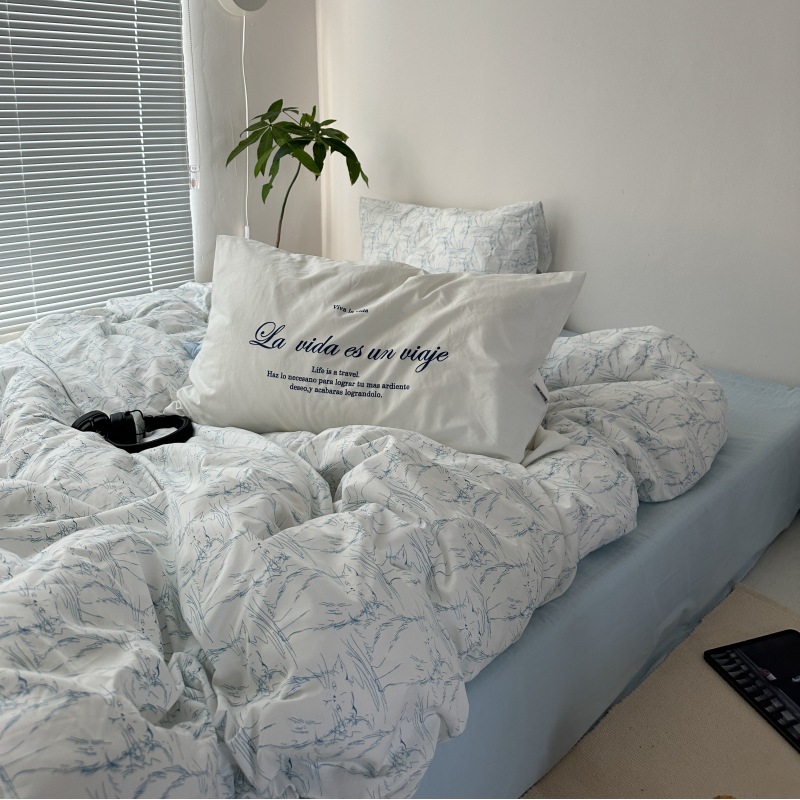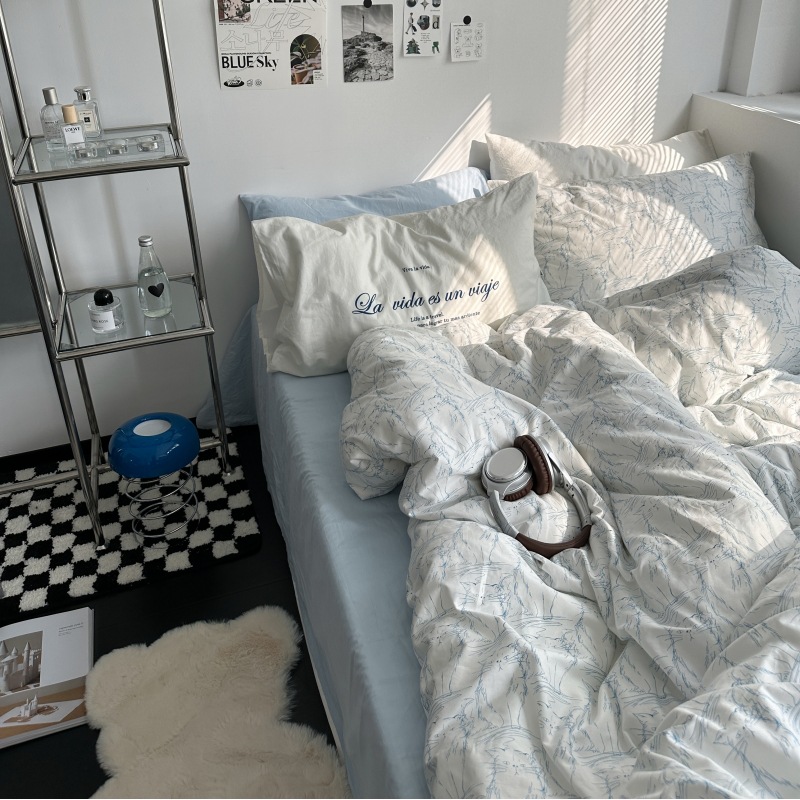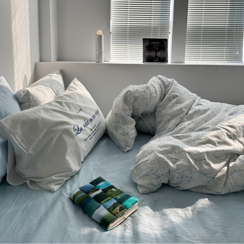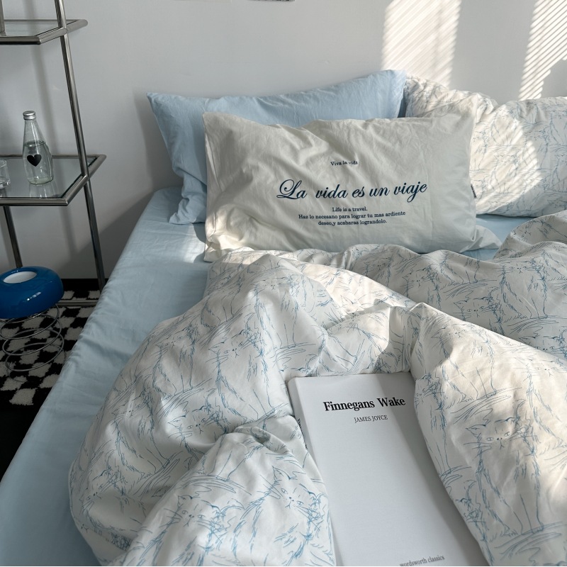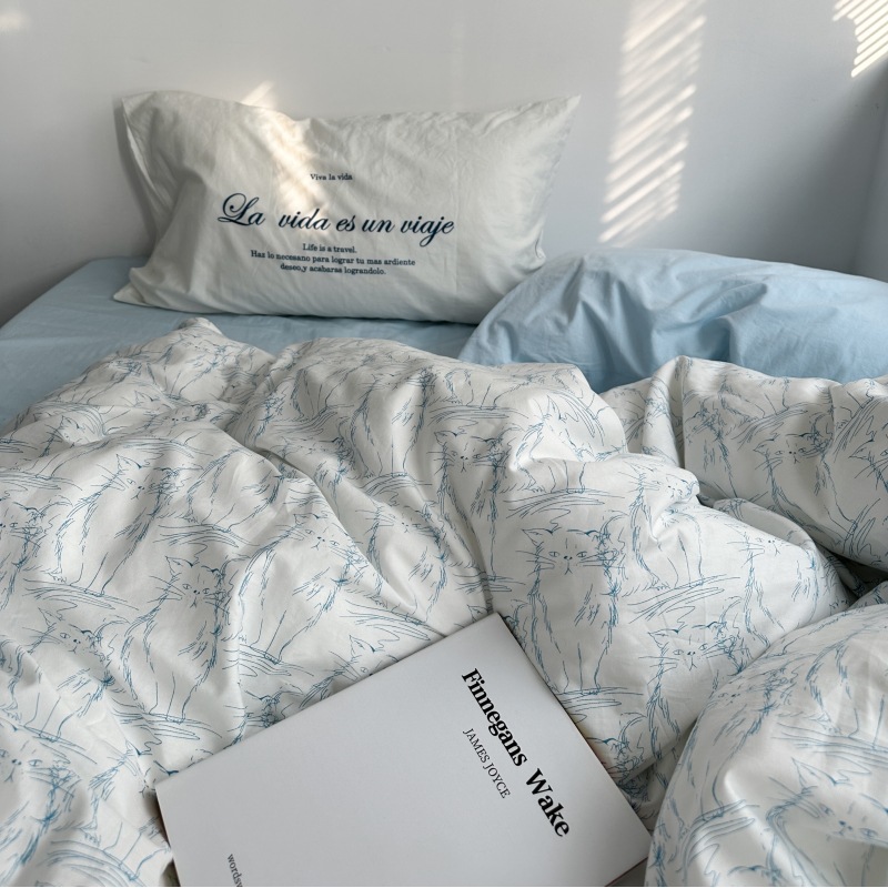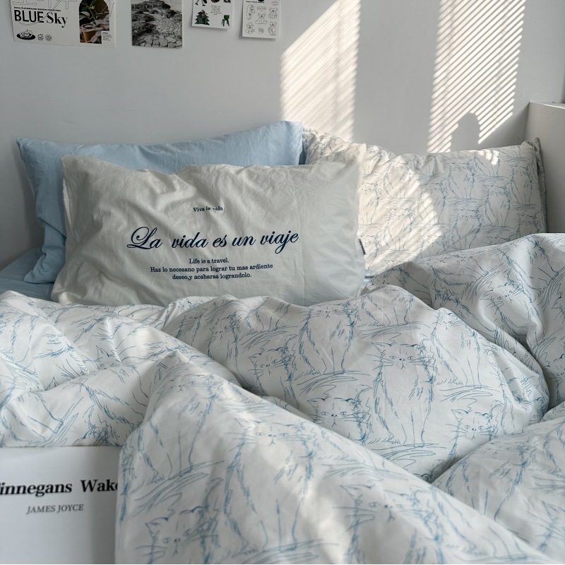 默认枕套一对猫咪,也可搭配图蓝色英文字母枕套 (每套➕5块 )和水蓝色/盐白色,床单/床笠颜色 水蓝色