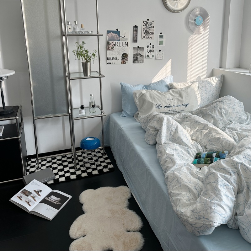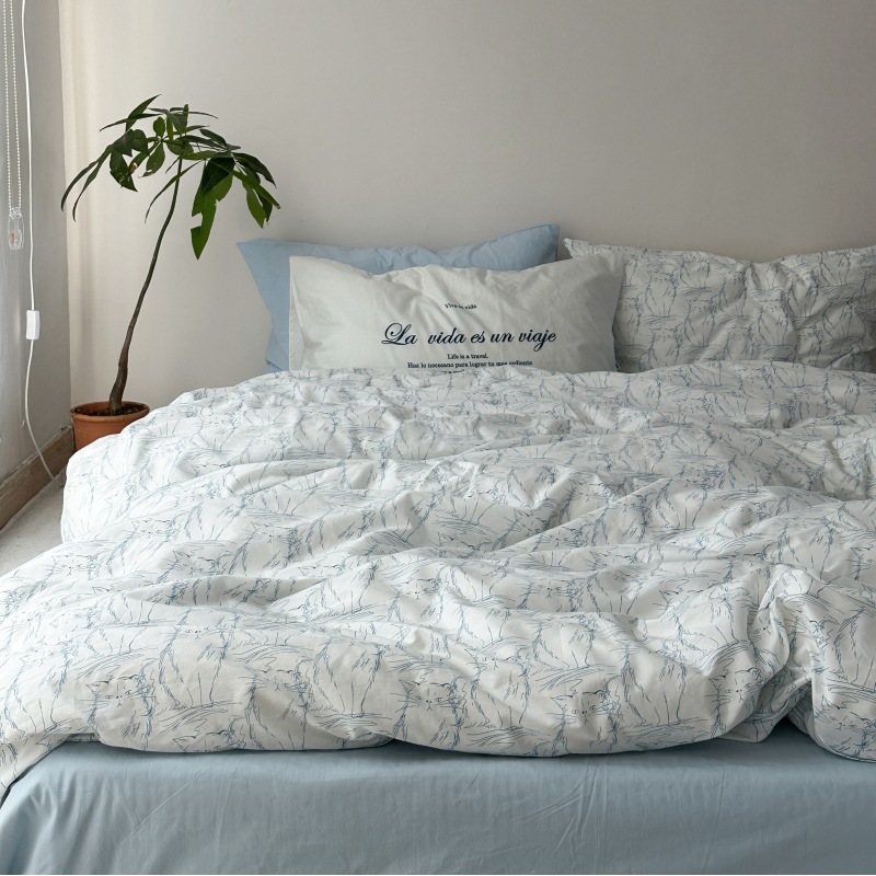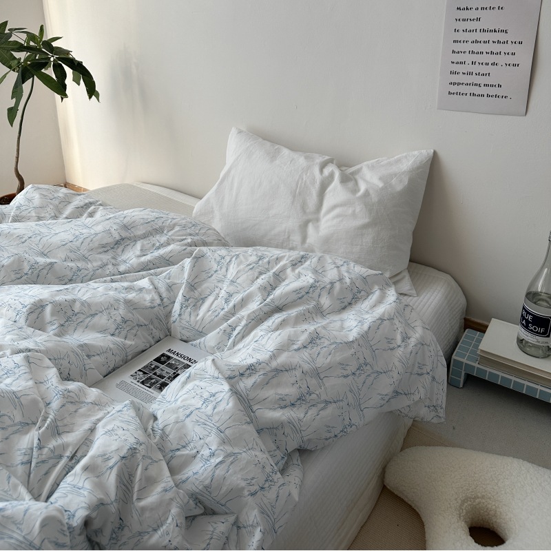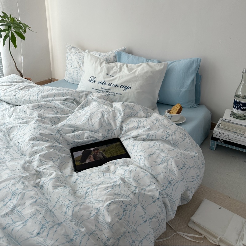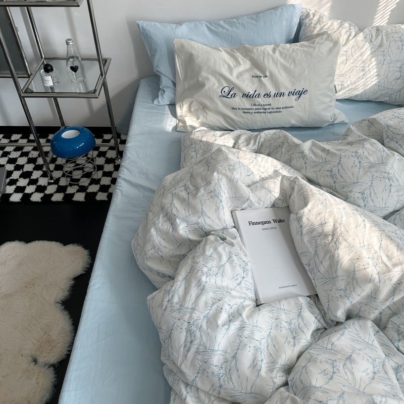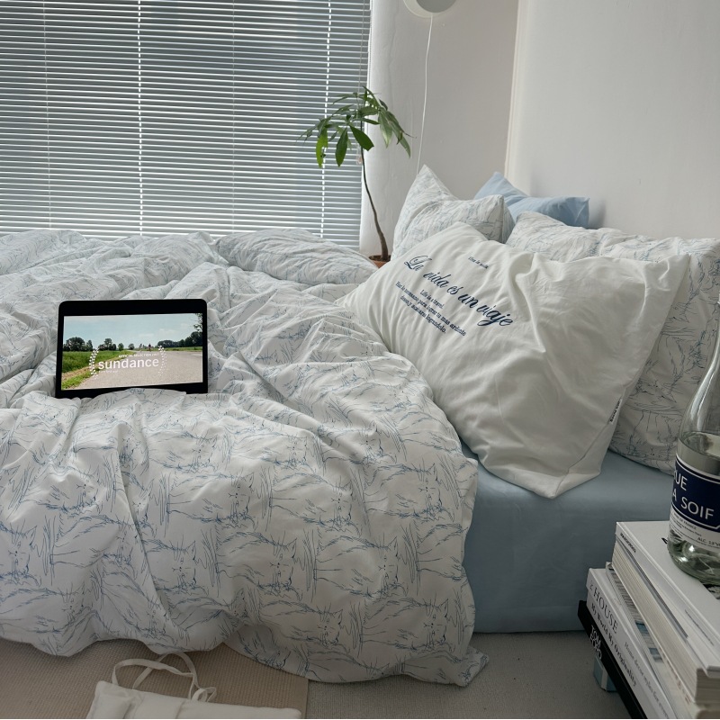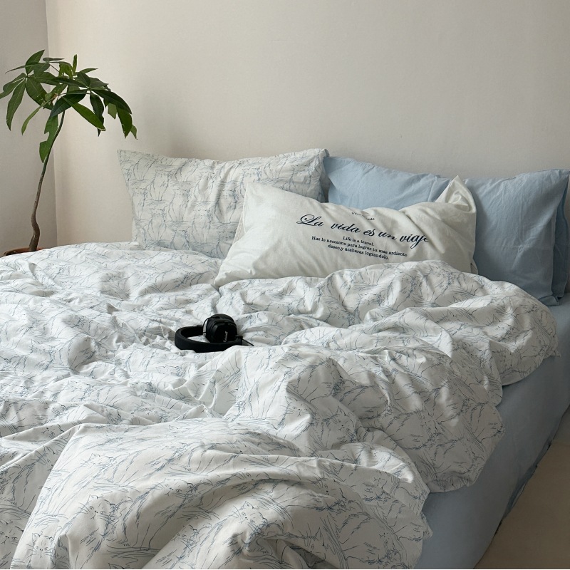 默认枕套一对猫咪,也可搭配图蓝色英文字母枕套 (每套➕5块 )和水蓝色/盐白色,床单/床笠颜色 水蓝色