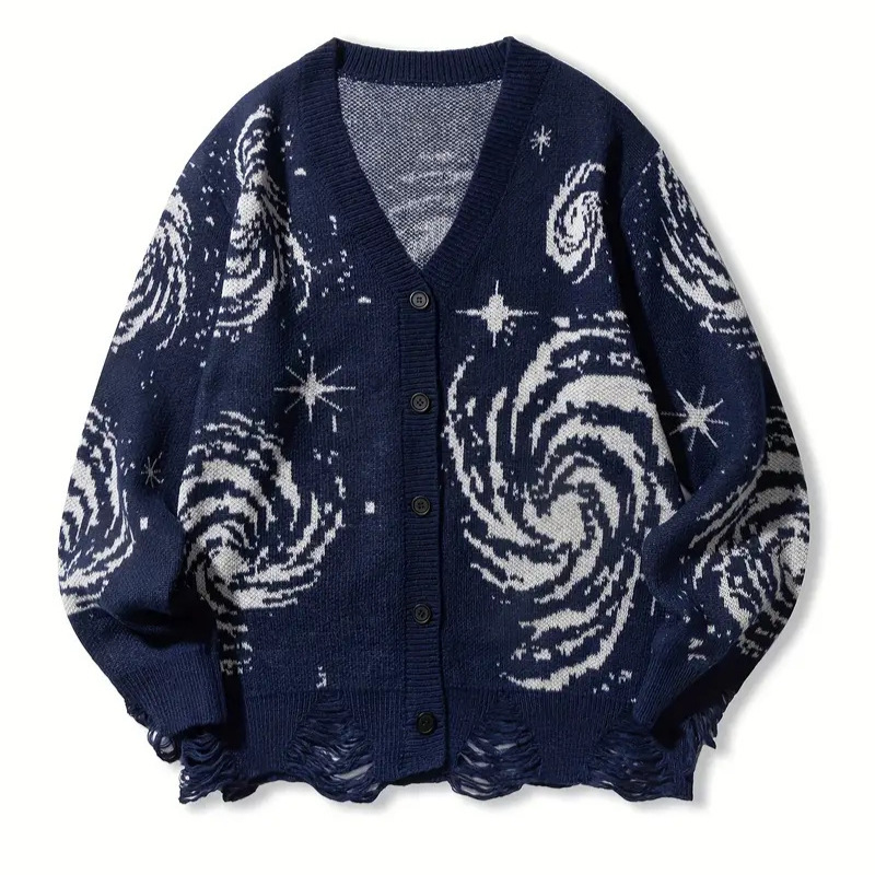 クロスボーダー新欧米メンズニットシャツY2Kレトロ渦巻線ジャカード女性用ゆるい破れセーターカーディガン
