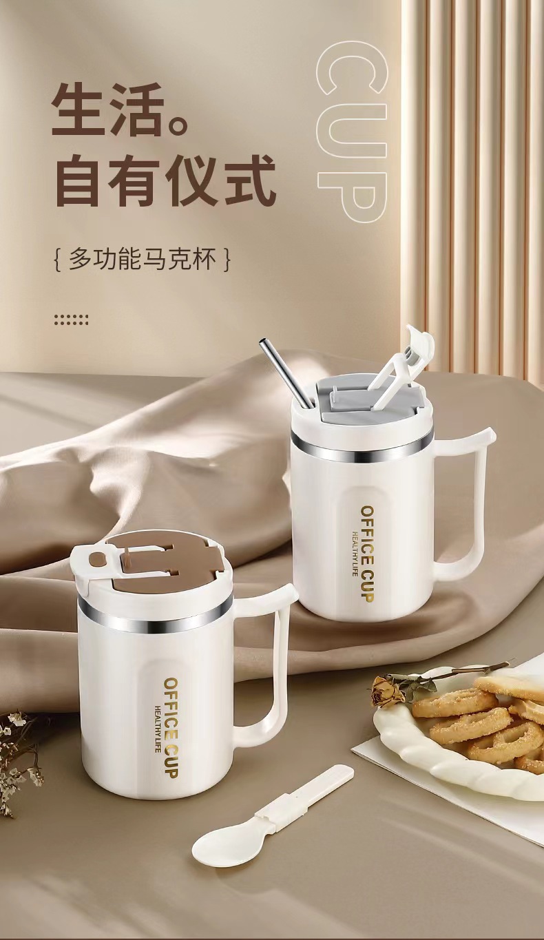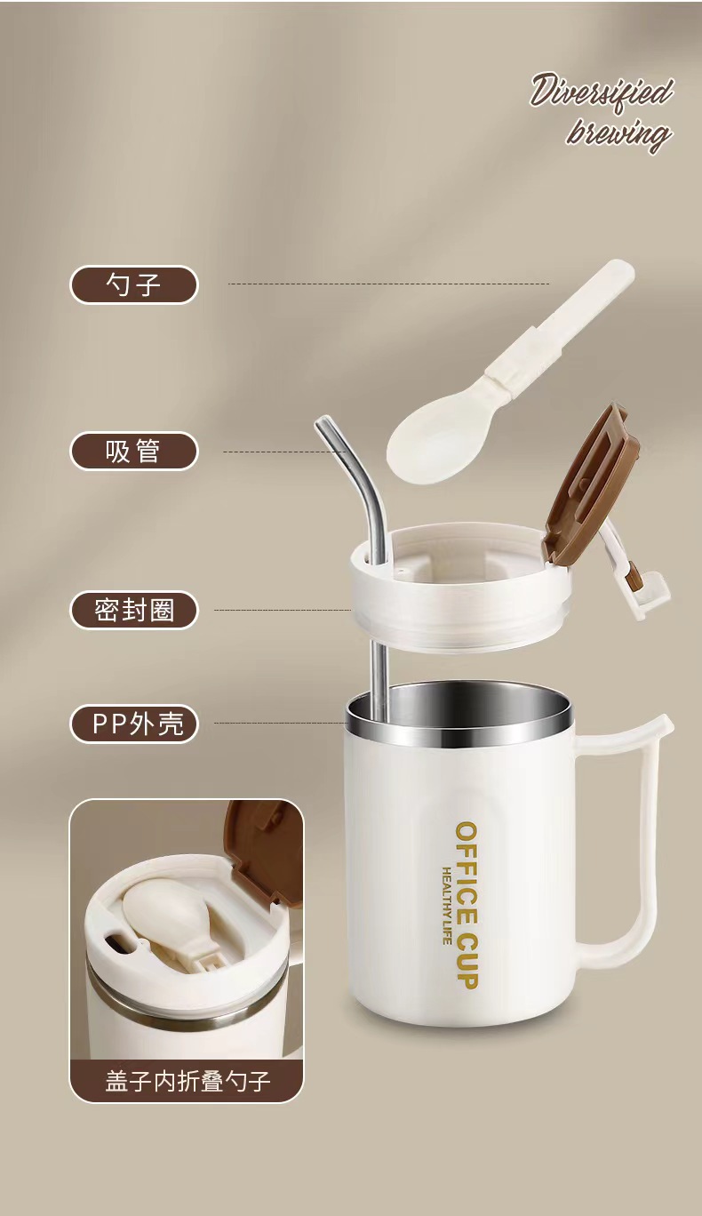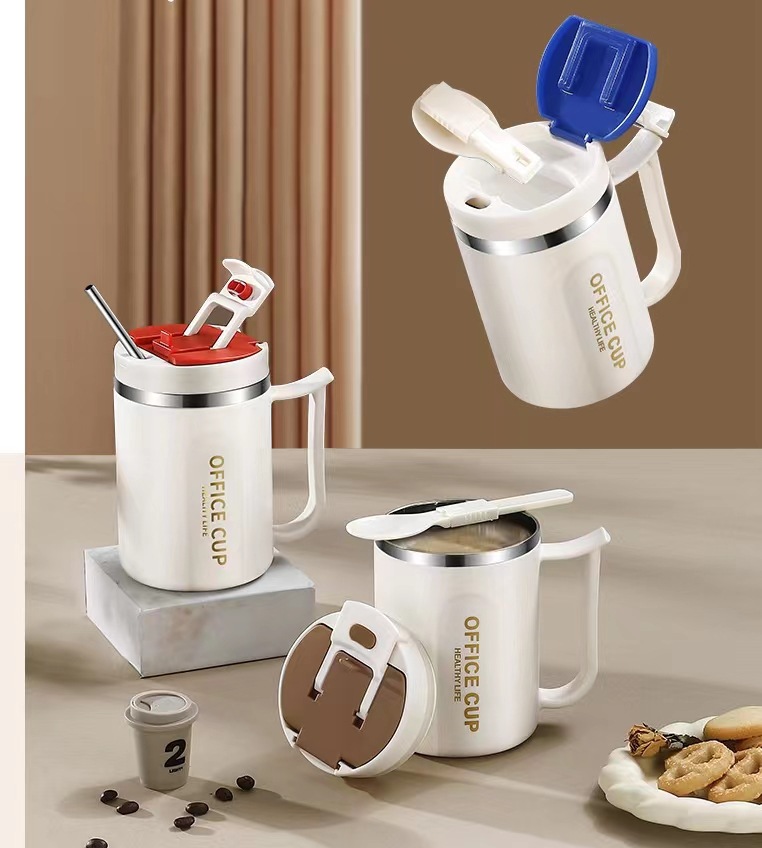 コーヒーカップステンレススプーン付き高颜値保温カップ大容量ストロー付きマグカップ水カッププレゼントロゴ