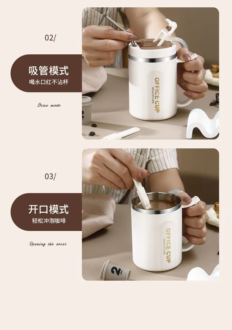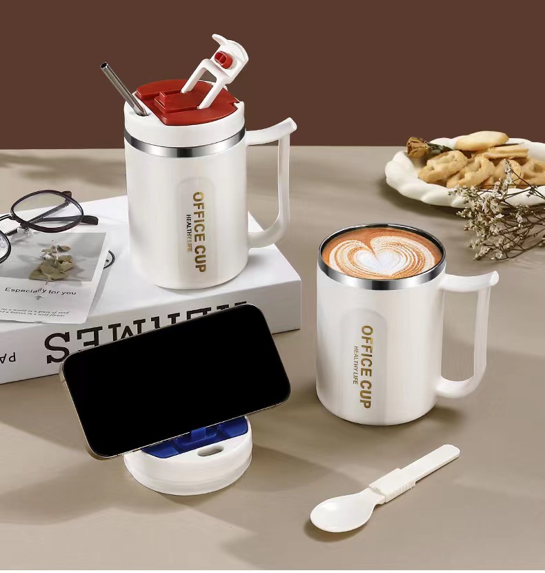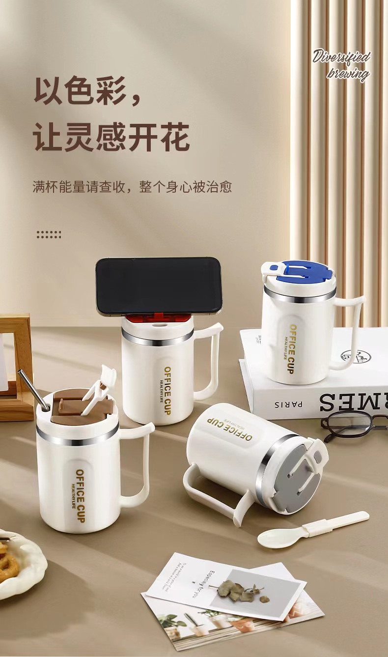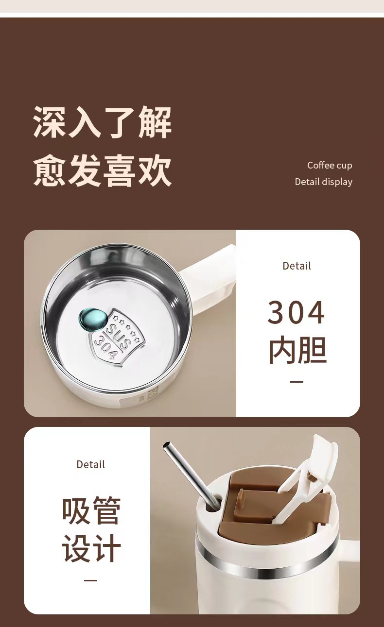 コーヒーカップステンレススプーン付き高颜値保温カップ大容量ストロー付きマグカップ水カッププレゼントロゴ