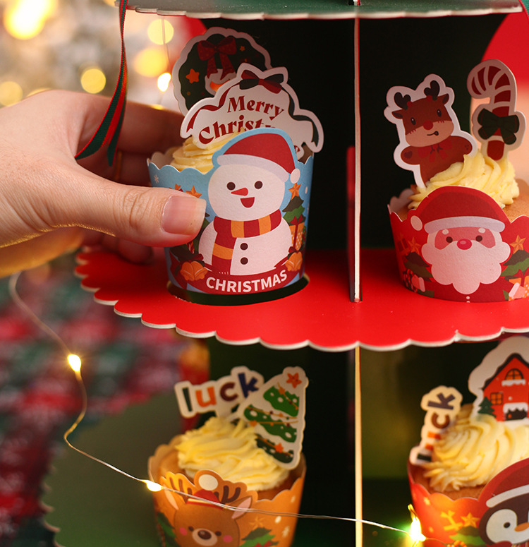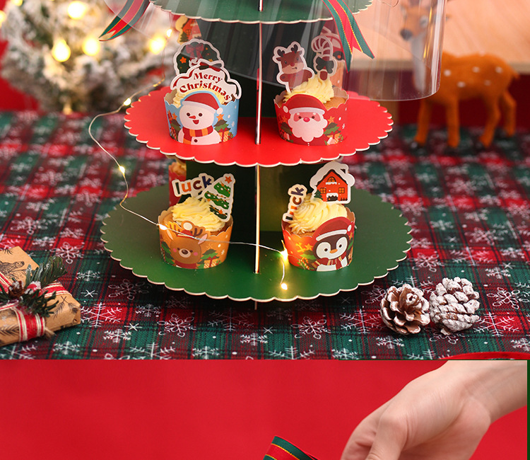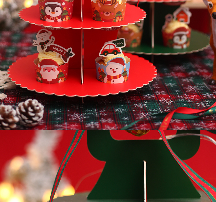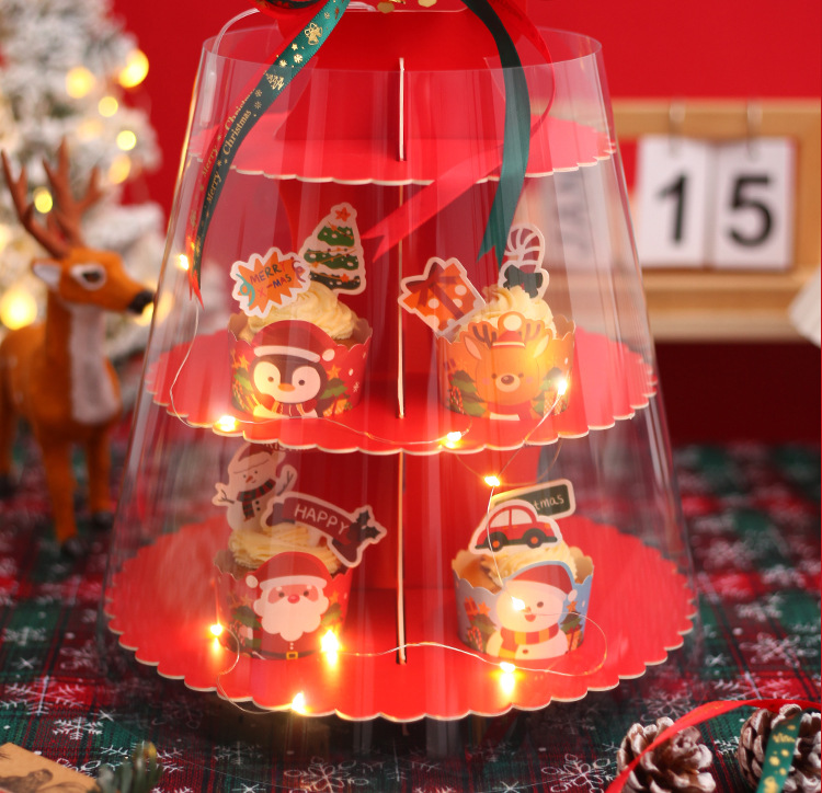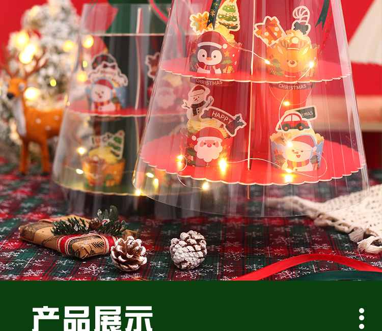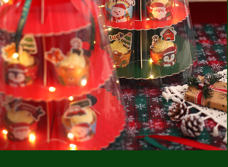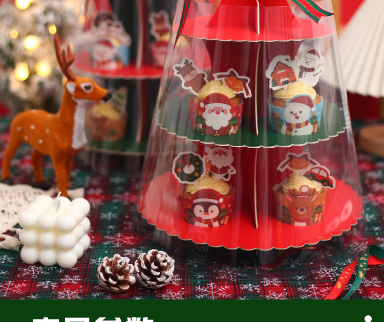 クリスマスベル(10個),サンタクロースの紙コップ 50個,クリスマス雪だるま紙コップ 50個,クリスマスヘラジカ紙コップ 50個,クリスマスペンギン紙コップ 50個,クリスマスカード 10枚 150枚,1cmベルレッドリボン(約10本),クリスマスミックスカラーハット(15個),1cmベルグリーンリボン(約10本),2cmの赤と緑の縞リボン(約10本),ゼムクリップ(約100本),クリスマスステッカー 10枚 220枚,赤と緑のデザートスタンド 1個(透明カバー含む),赤いデザートスタンド 1個(透明カバー含む),三層台形 1セット,ホワイト-4層レース透明カバー-1セット,レッド-4層レース透明カバー-1セット,ホワイト-3層レース透明カバー-1セット,4層台形 1セット,レッド-三層レース透明カバー-1セット