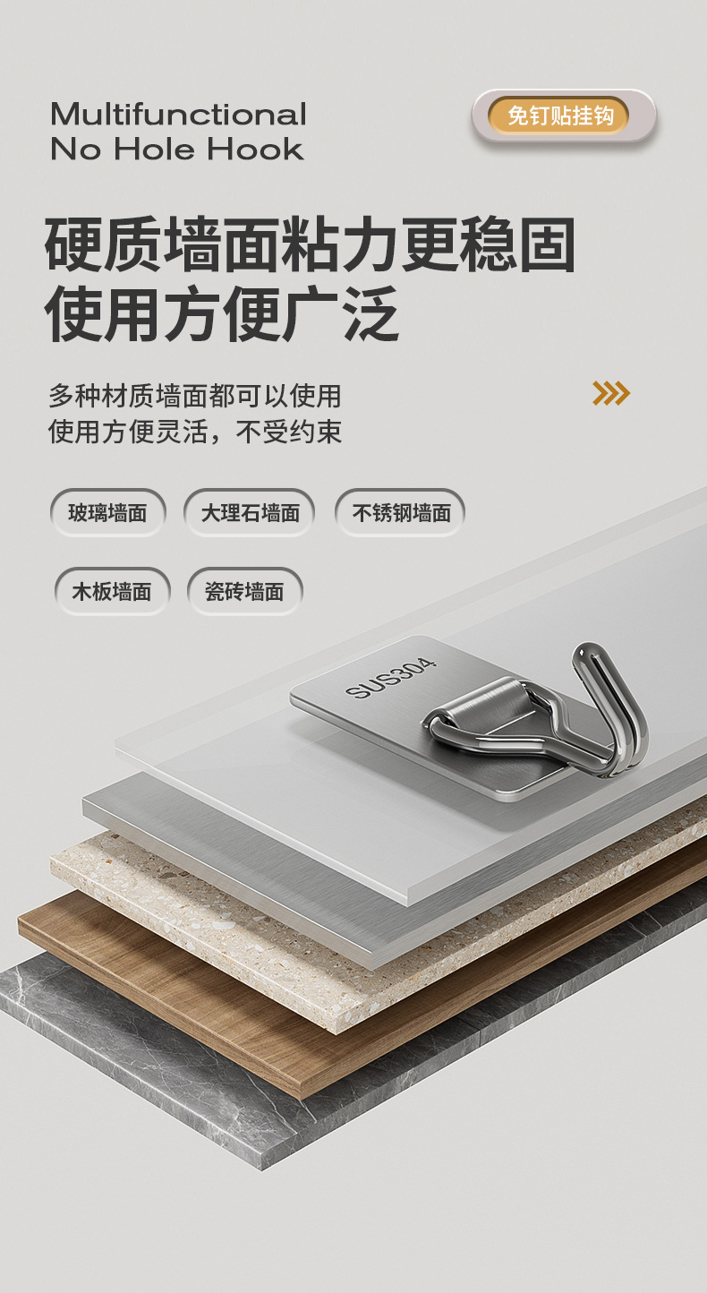 不锈钢挂钩粘胶免打孔强力承重厨房门后浴室粘钩无痕墙壁宿舍衣勾