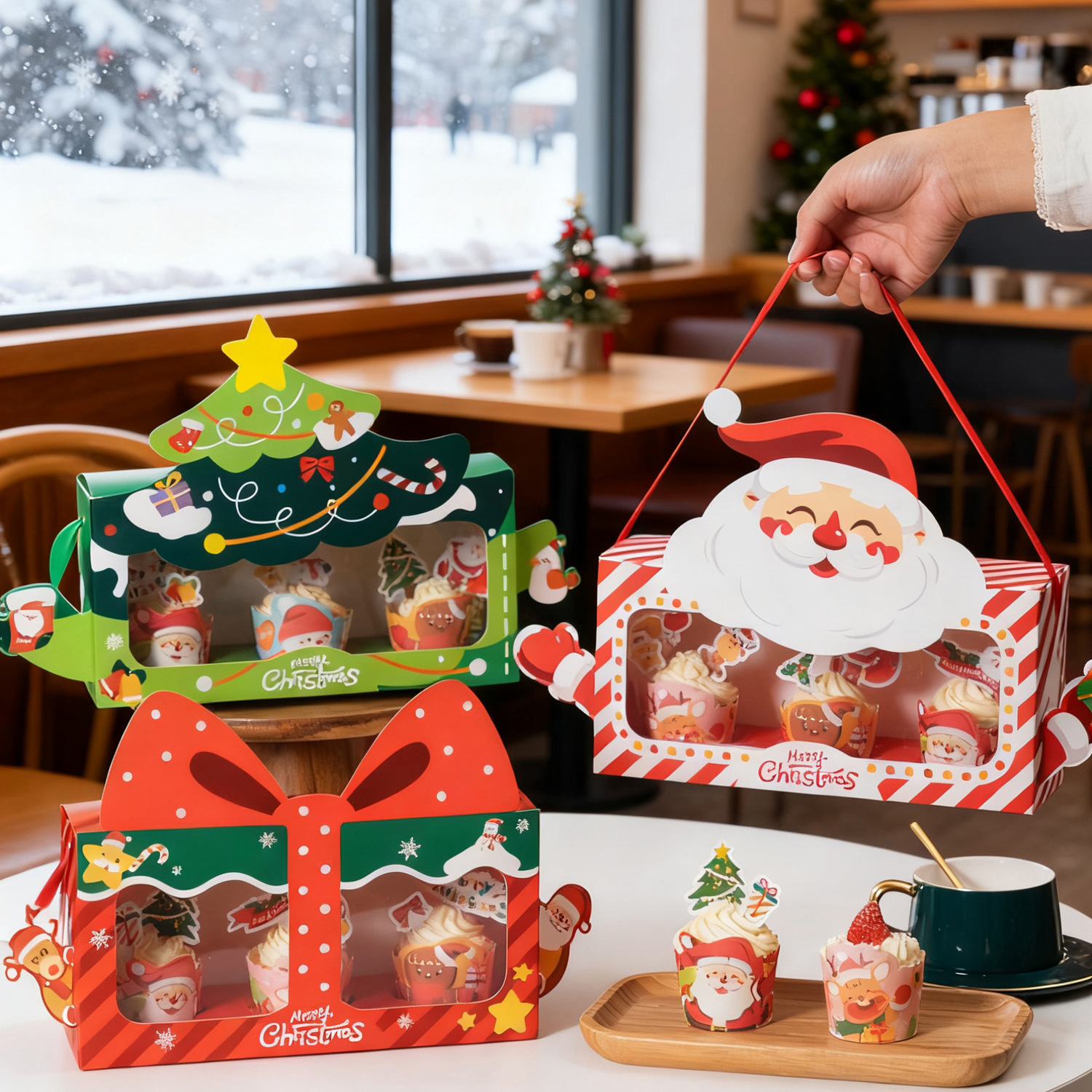 3粒入り紙コップケーキ箱クリスマスcupcake包装箱平安夜手提げ窓マフィン箱手作りプレゼント