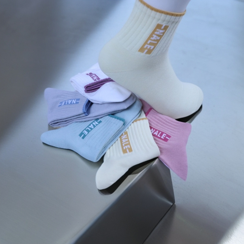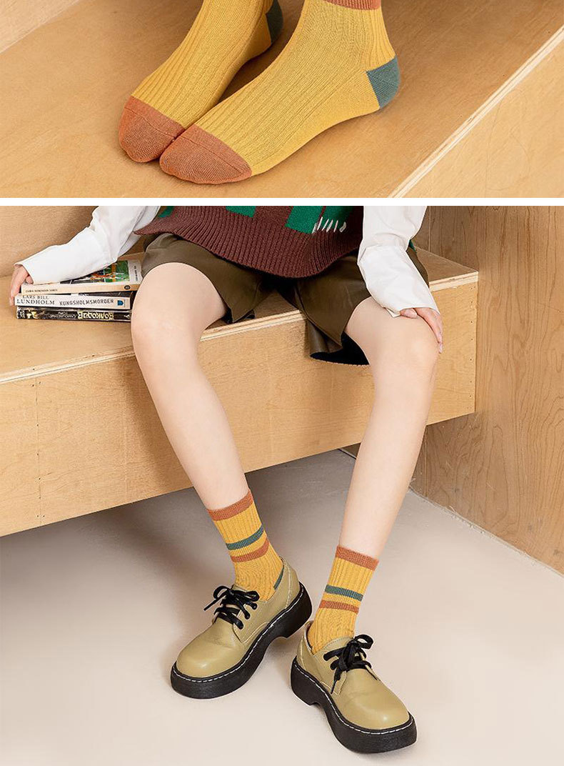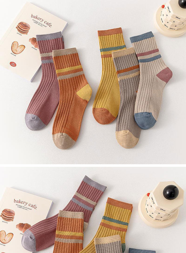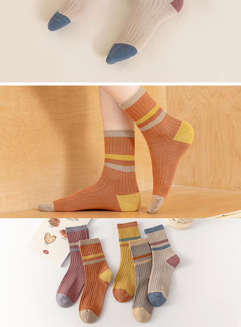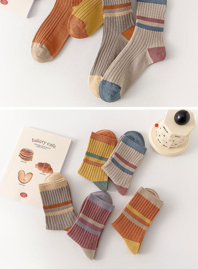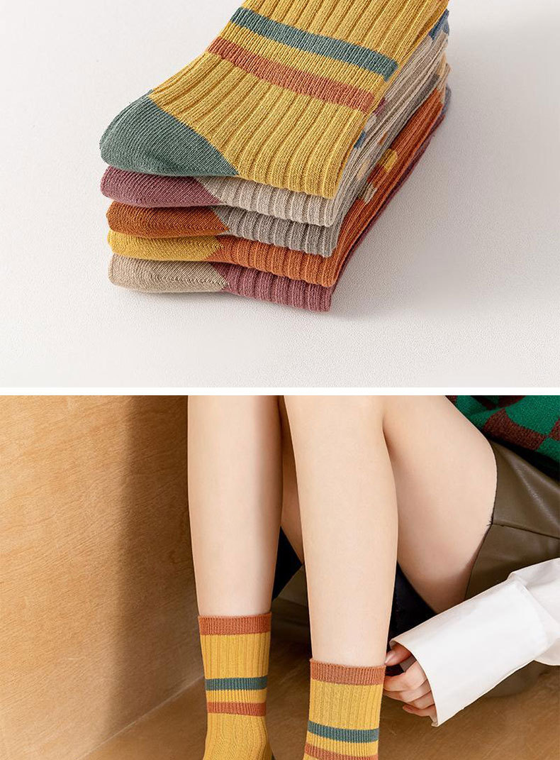 女性用春夏綿靴下、諸暨靴下業百納德シリーズ、シンプルな女性用綿靴下、コントラストカラーのストライプ柄ミッドカーフソックス