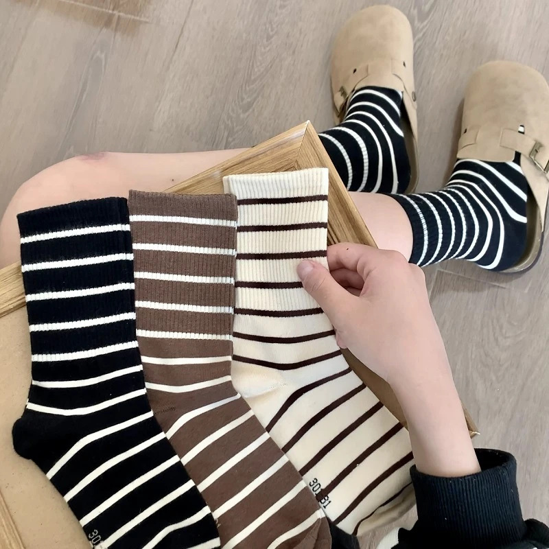 女性用ソックス、オールシーズン対応のミッドカーフソックス、ストライプ、多用途、パイルソックス、トレンディなインスタイル、女性用スポーツカジュアルロングソックス