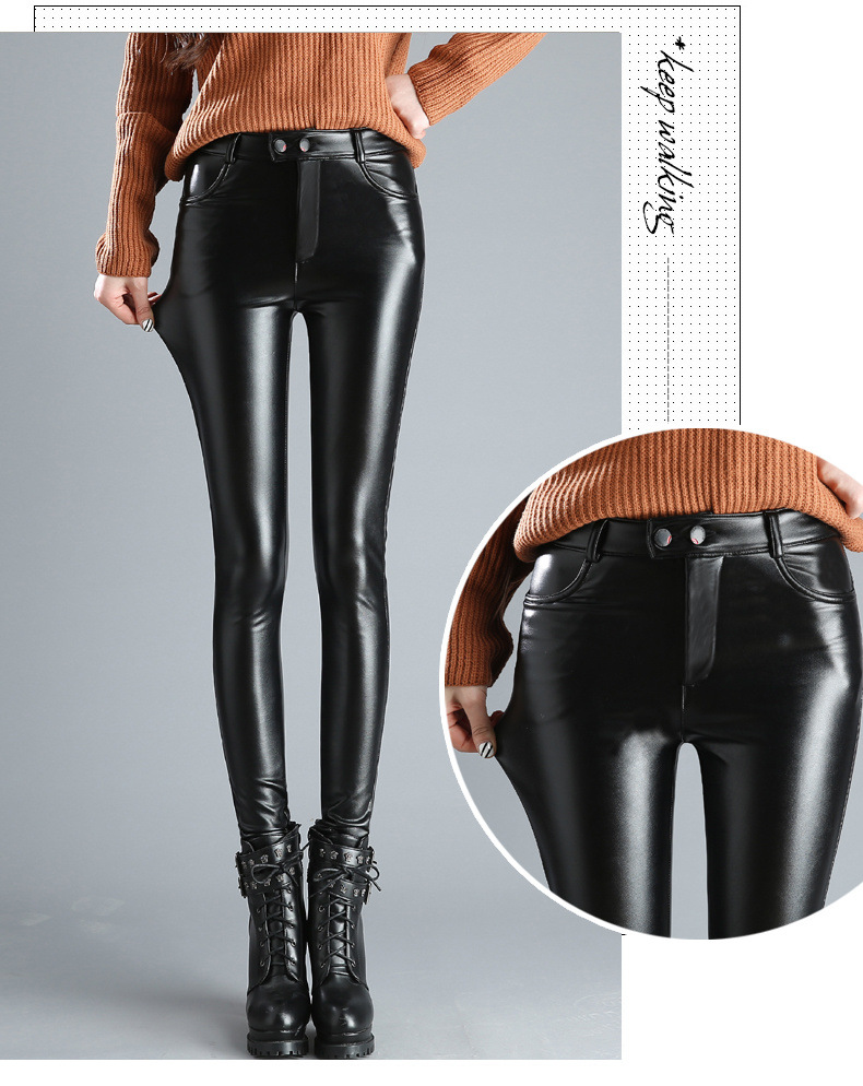 革のズボンの女性の秋冬のレギンスの外は黒色の2025新型の高腰のベルベットの厚いpuのタイトな足のズボンを着ます。