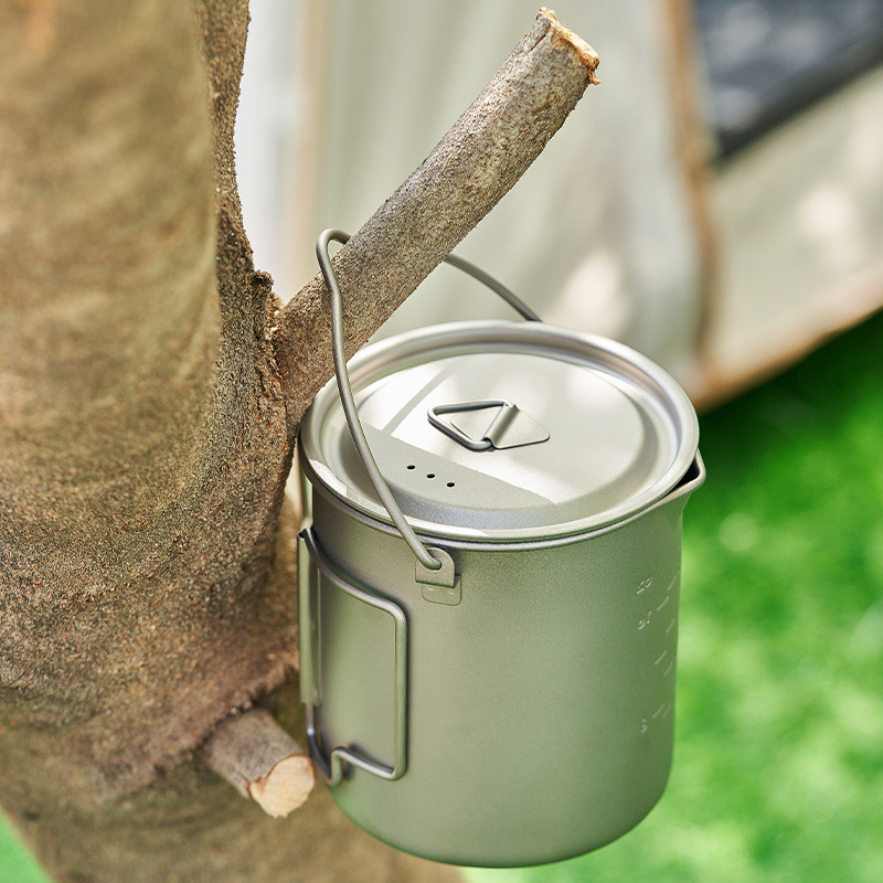 アウトドア用純チタンカップポット 折りたたみハンドル付き 旅行キャンプ用調理器具 シングルランチボックス 蓋付き 750ML インスタントラーメン 軽量