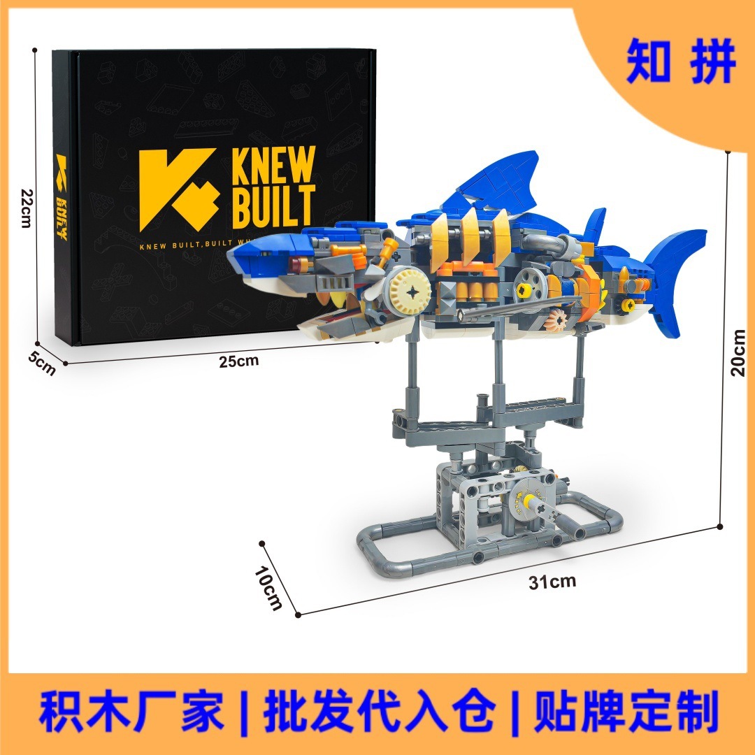 跨境机械鲨仿生拼装儿童鲨鱼绿光巴士积木模型摆件玩具魔法书批发