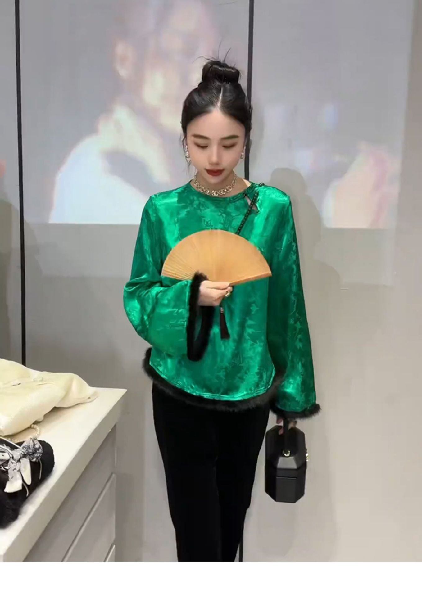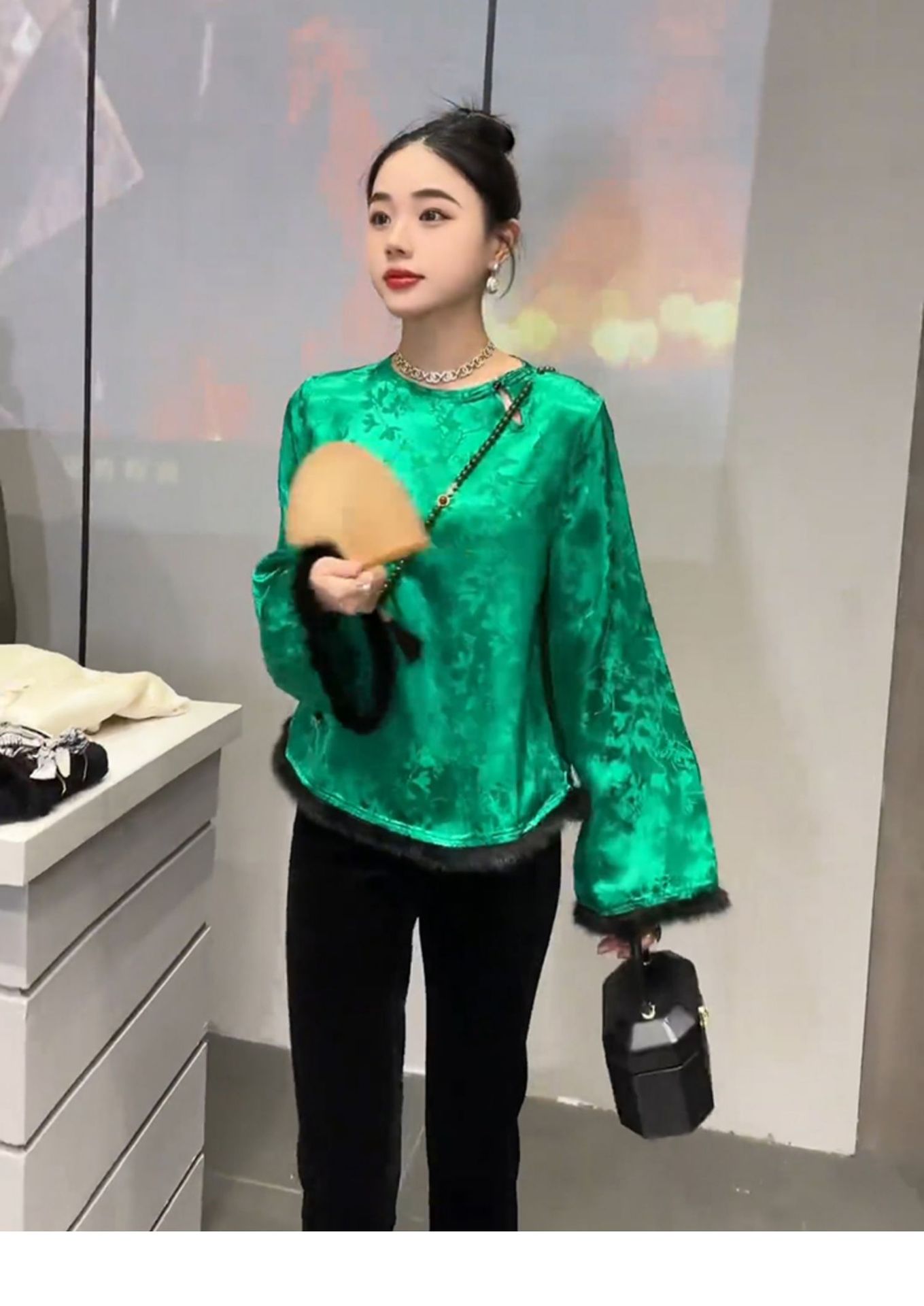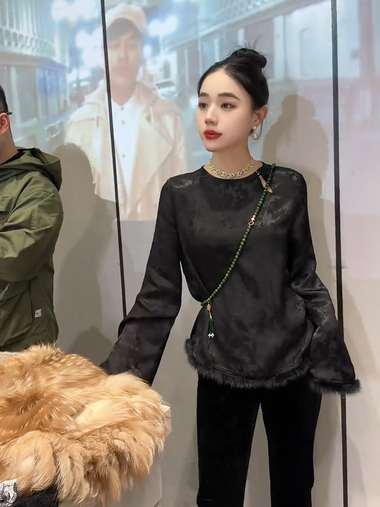 批发冬季中式国风加绒内搭打底衫盘扣袖口毛毛唐装宽松小衫T恤衫