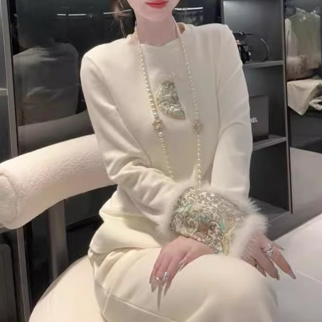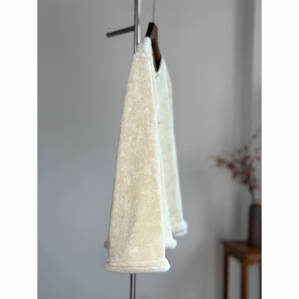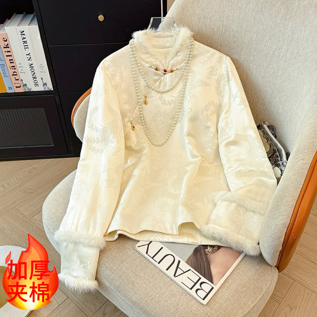 感白色丝绒上衣女秋冬加绒加厚打底衫新中式国风内搭水貂毛毛