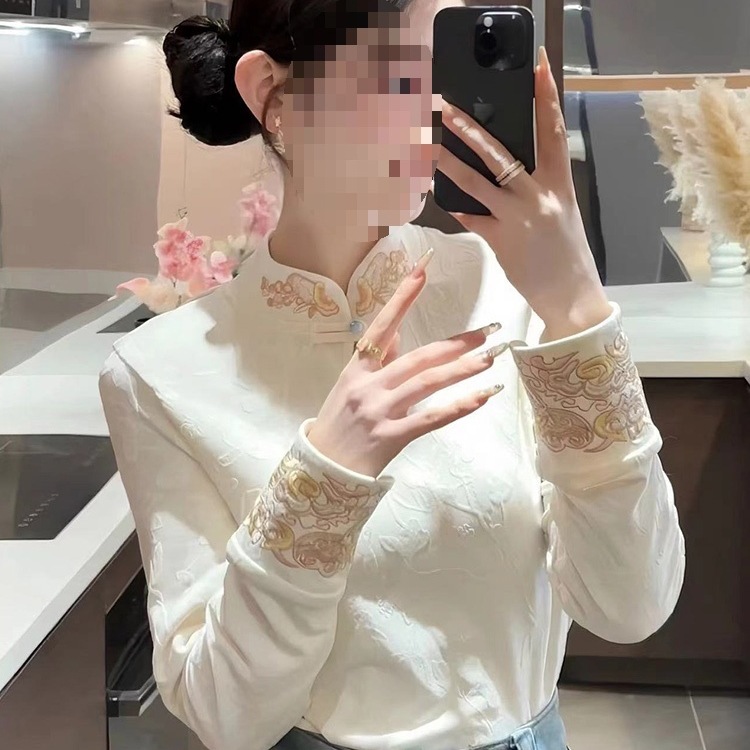 国风秋冬保暖立领新中式刺绣T恤汉元素提花百搭打底衫日常上衣女