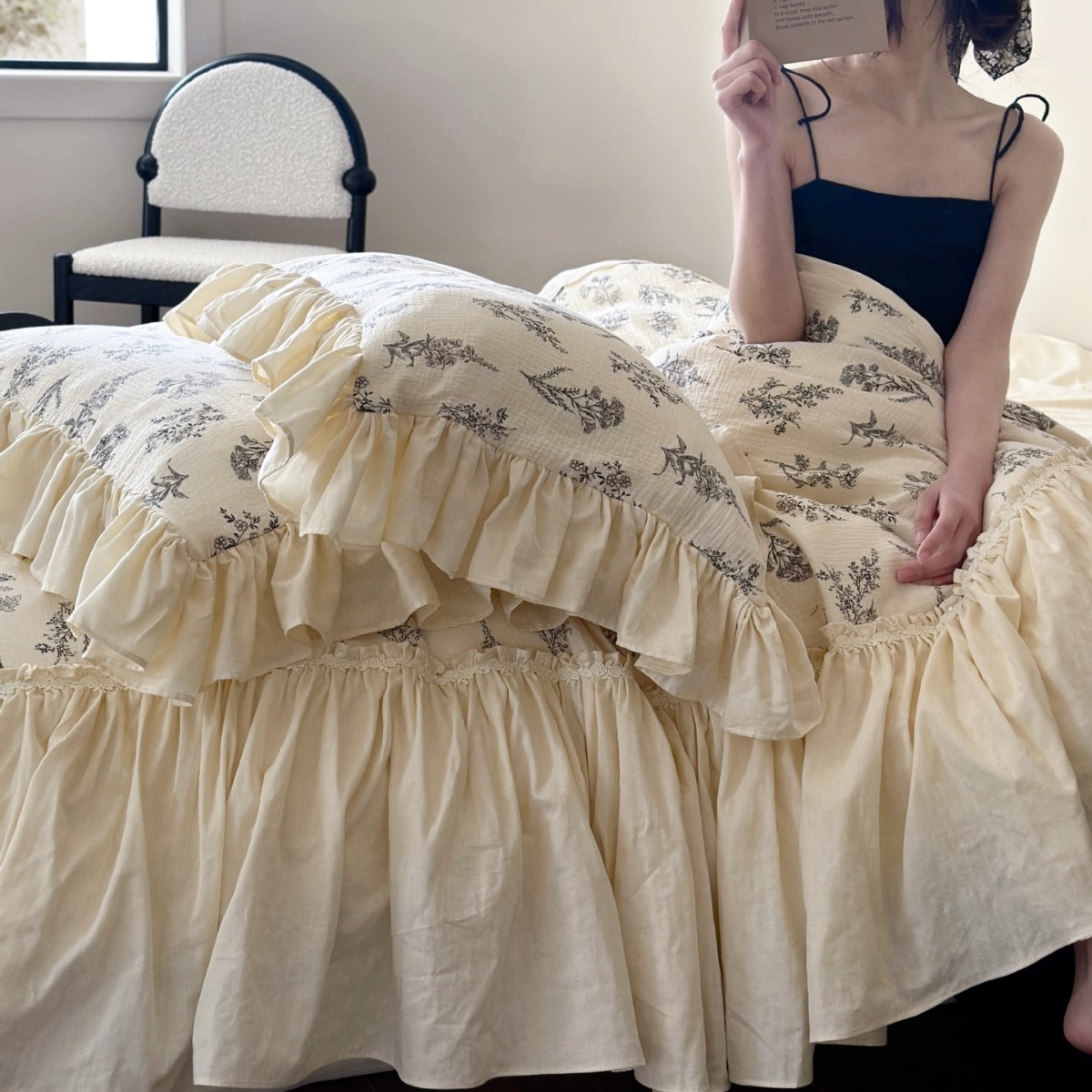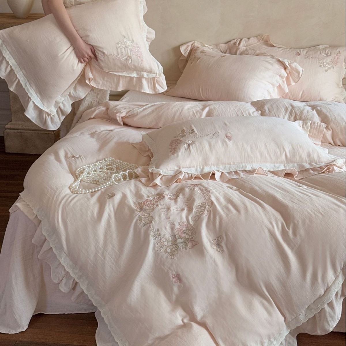 定制全棉镂空花边,被套四周双层荷叶花边,床裙款式。