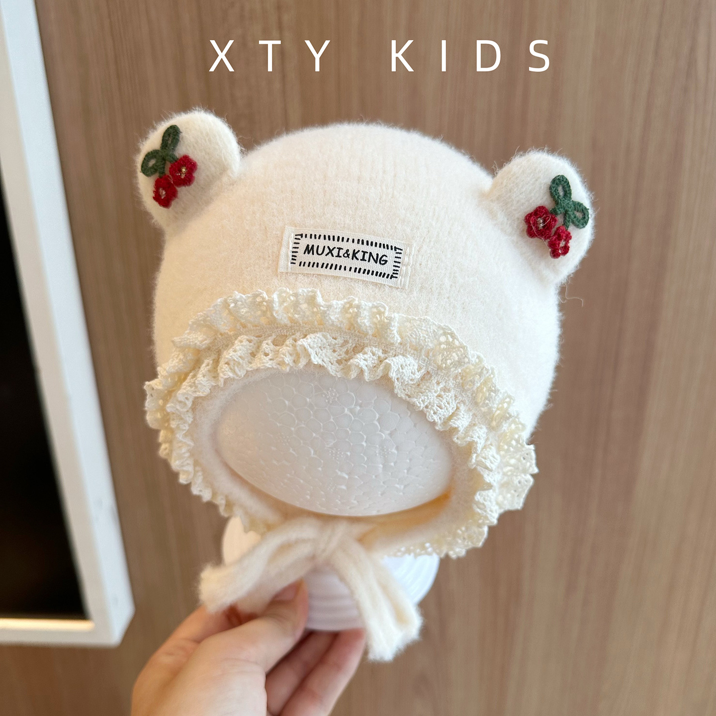 婴儿帽子6到12个月小月龄外出帽可爱樱桃花边女宝宝护耳帽秋冬款