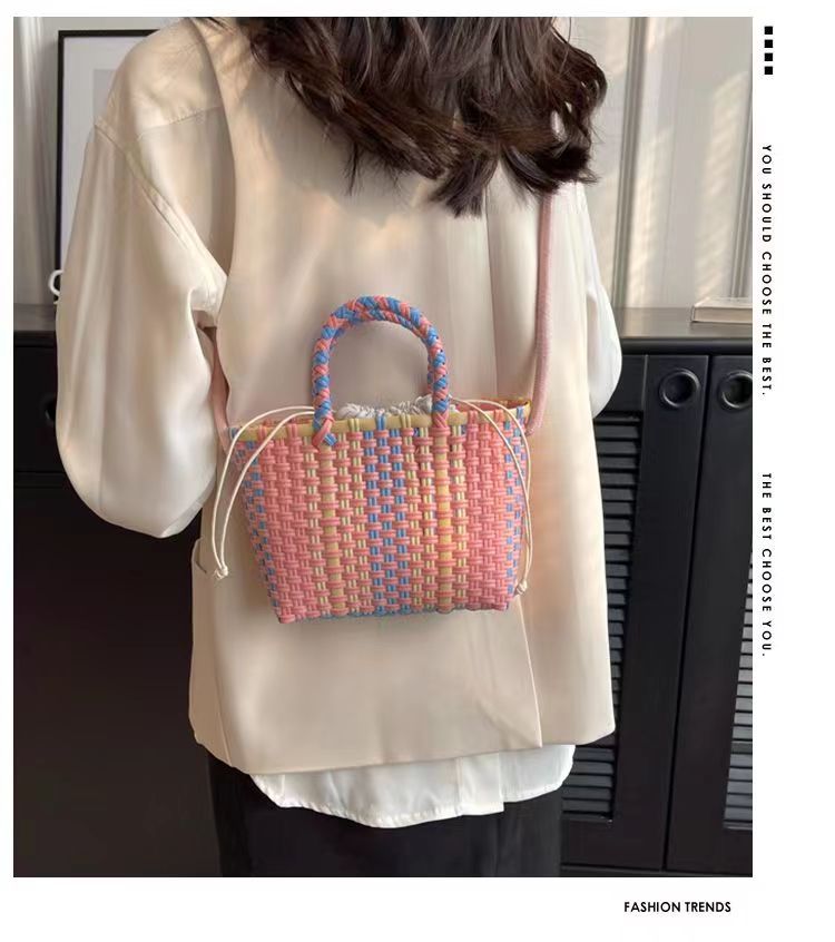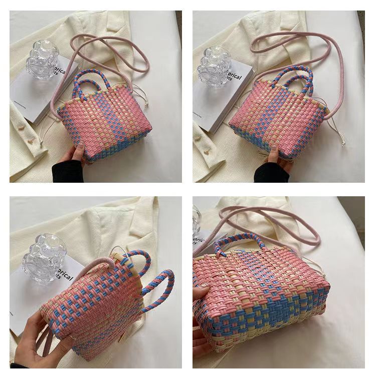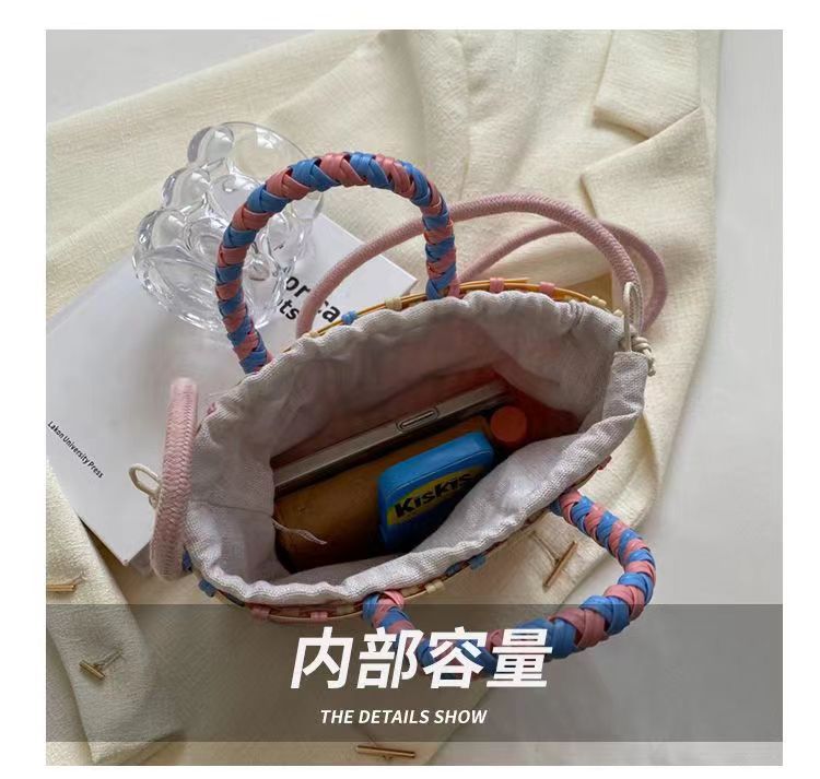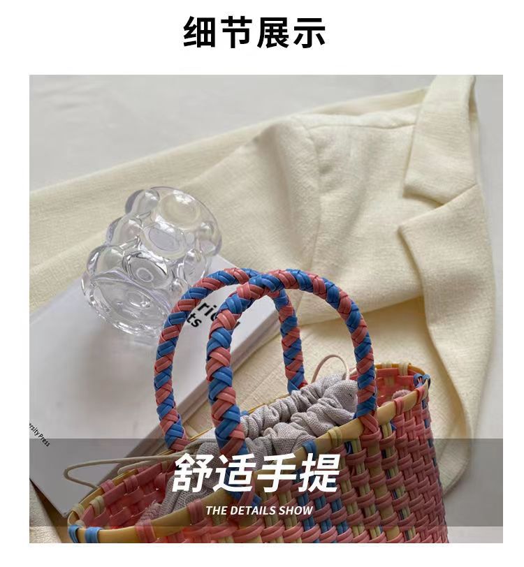 カラフルな籐編み水桶バッグ レディースバッグ 小型草編みバッグ 手提げ野菜かごバッグ 斜め掛け編みポータブルバッグ