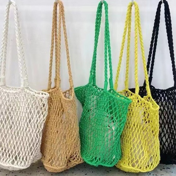 ワンショルダーの綿ロープ手織りコントラストカラーバッグ、ファッショナブルで多用途、ビーチでの休暇、レジャー、通勤、ニッチな旅行に最適です。