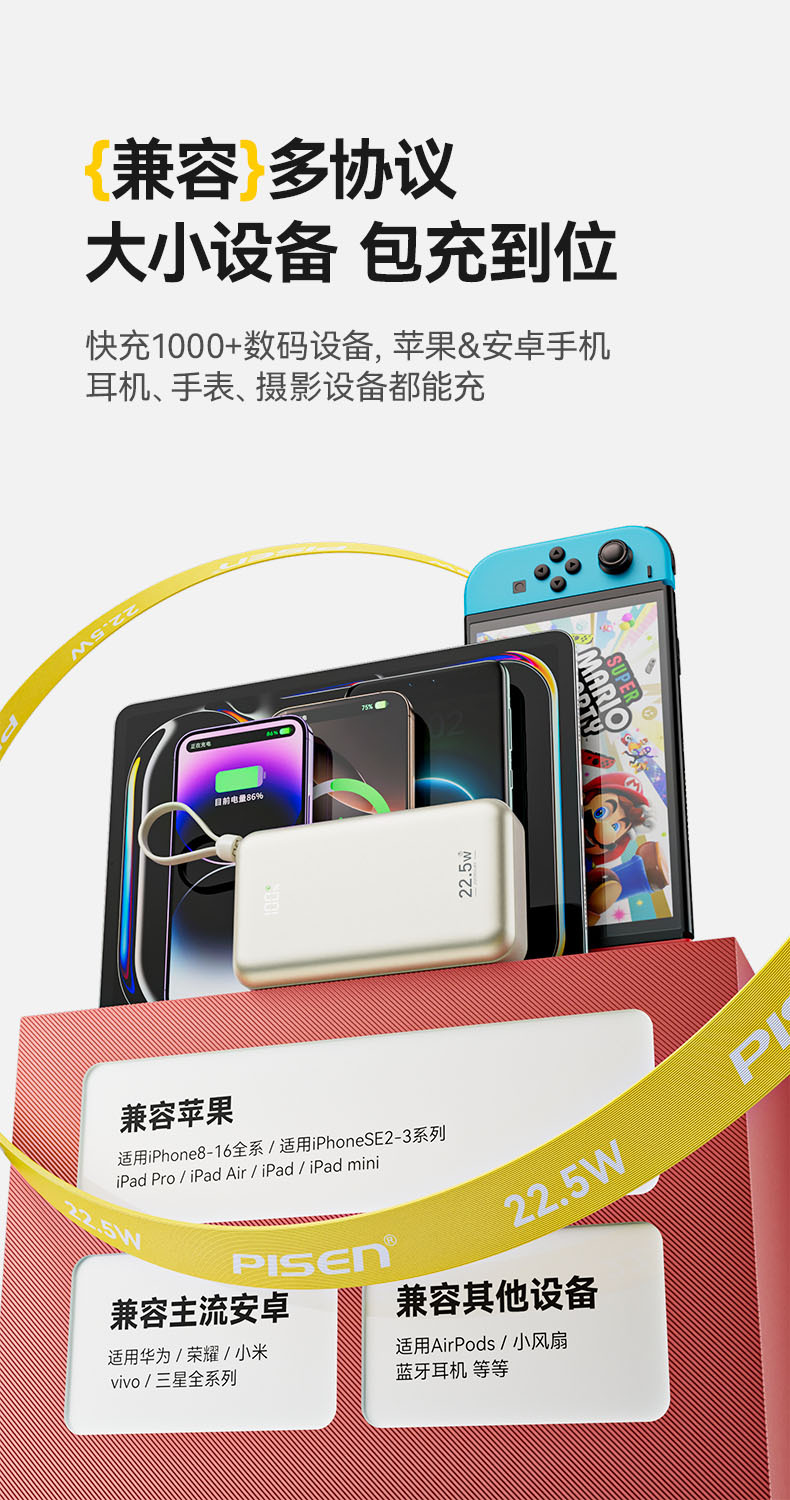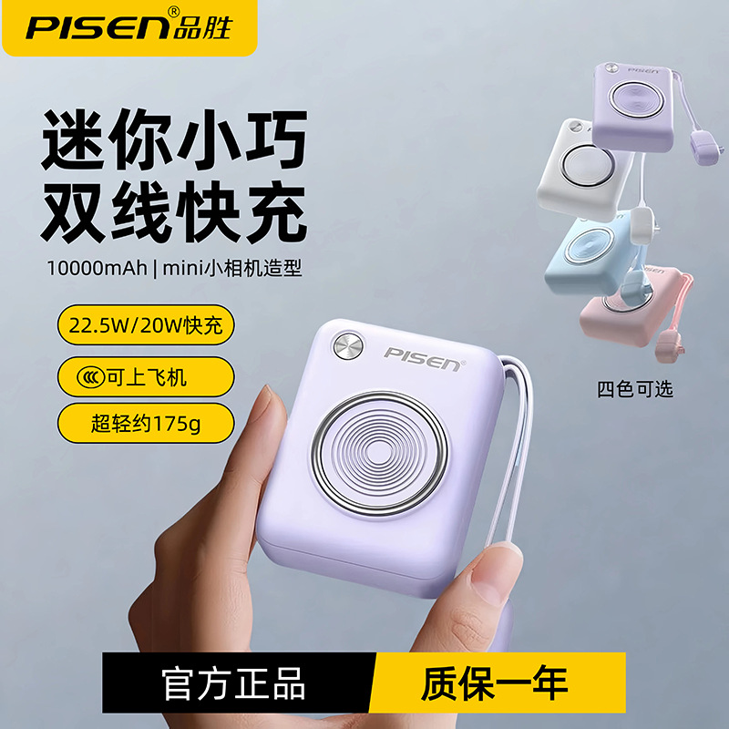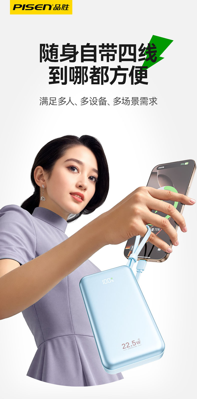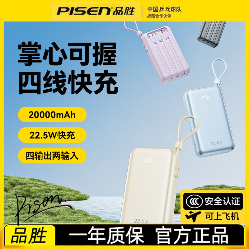 品胜充电宝20000毫安自带四线22.5W双向快充迷你移动电源适用苹果