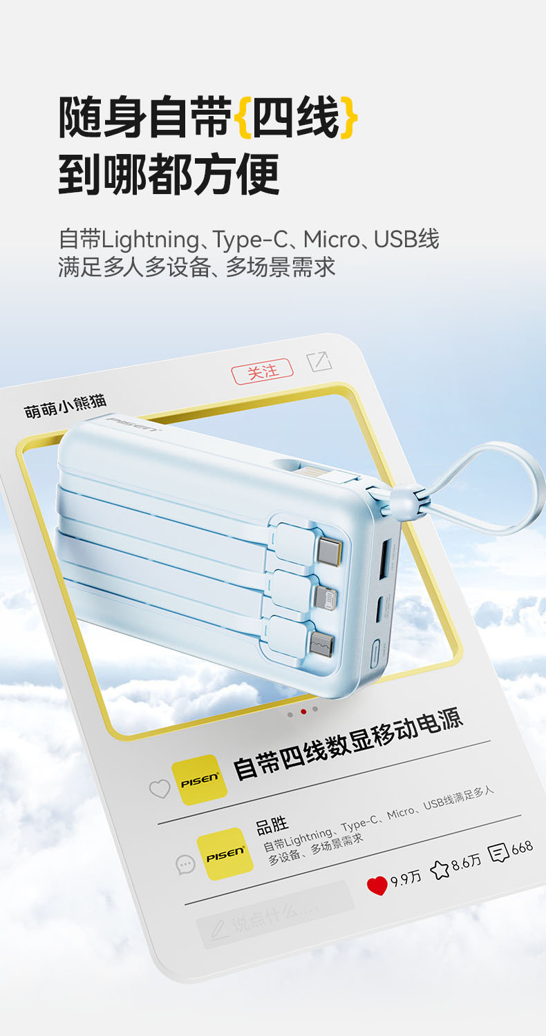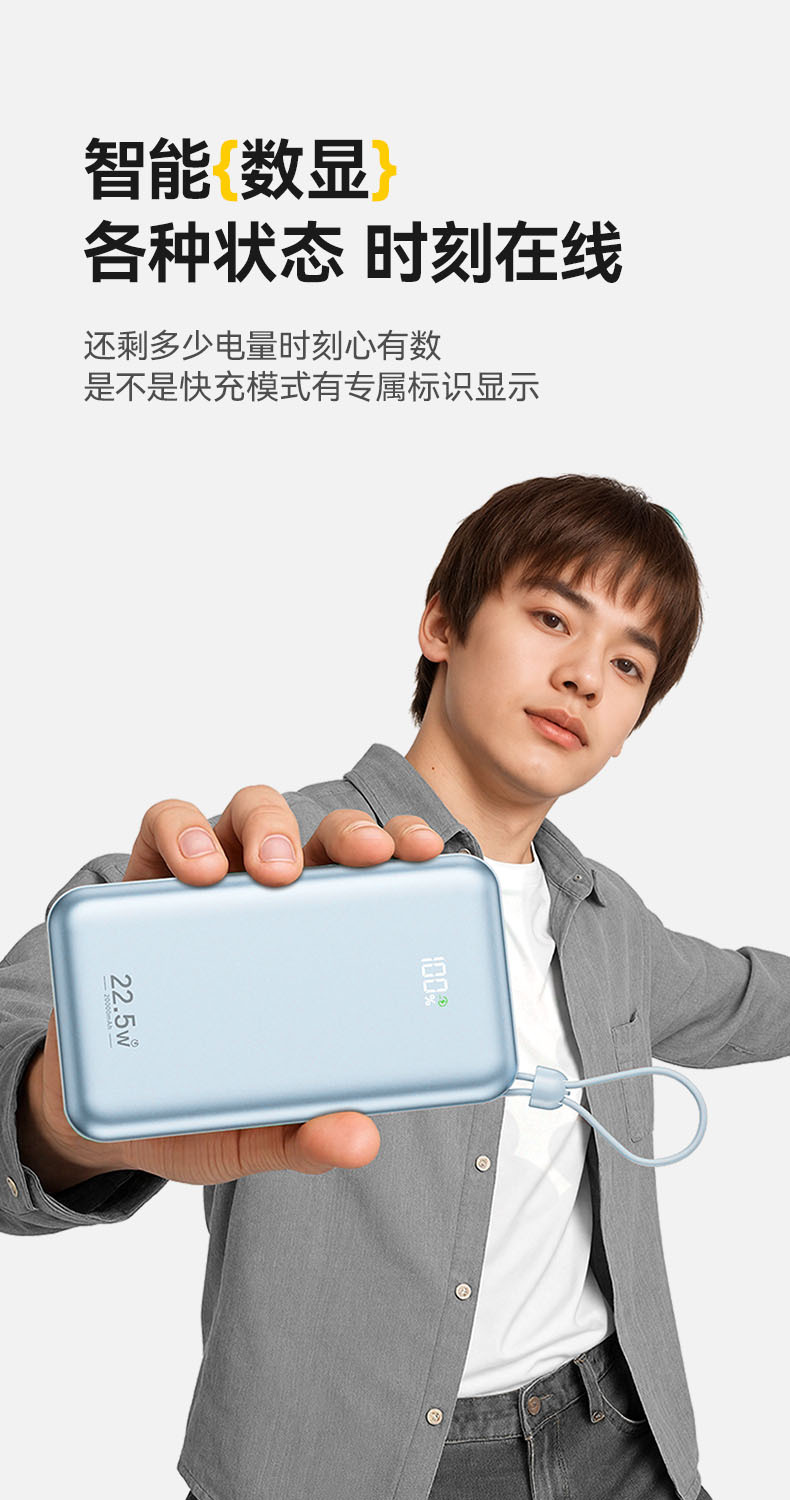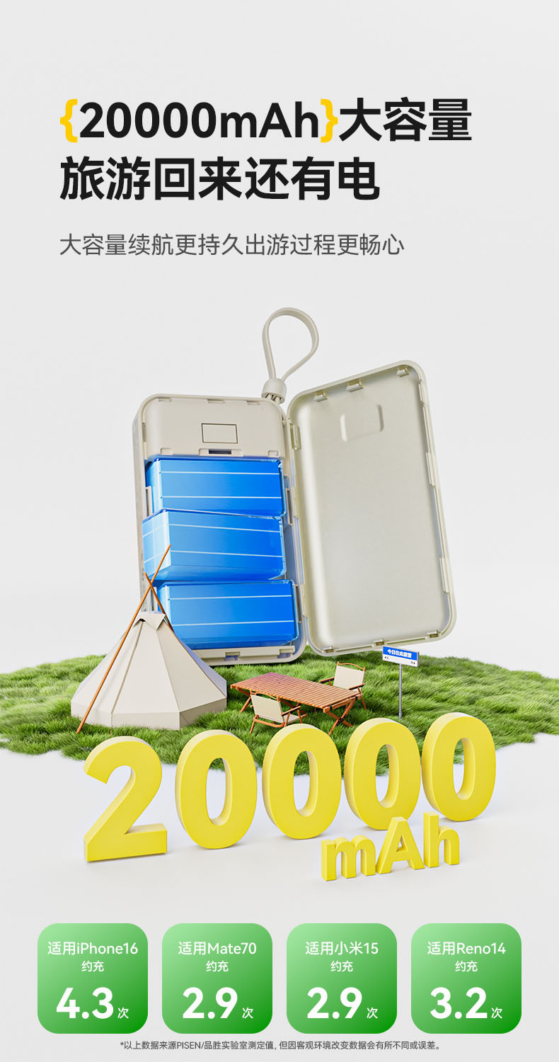 品胜2025新款大容量20000毫安迷你小巧便携自带线快充移动电源