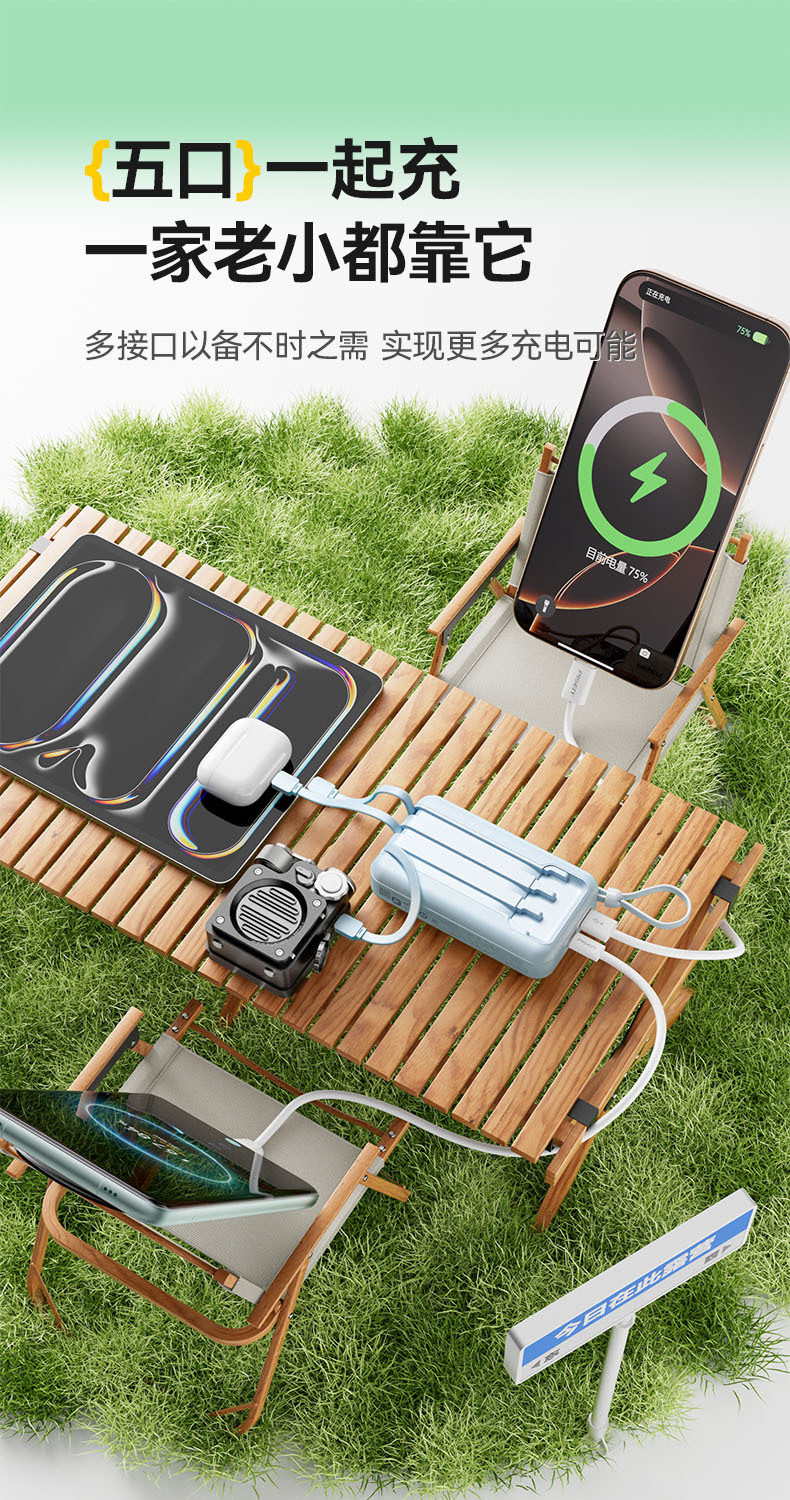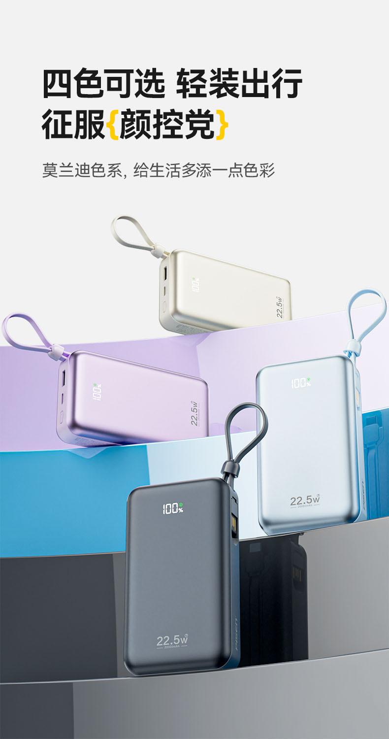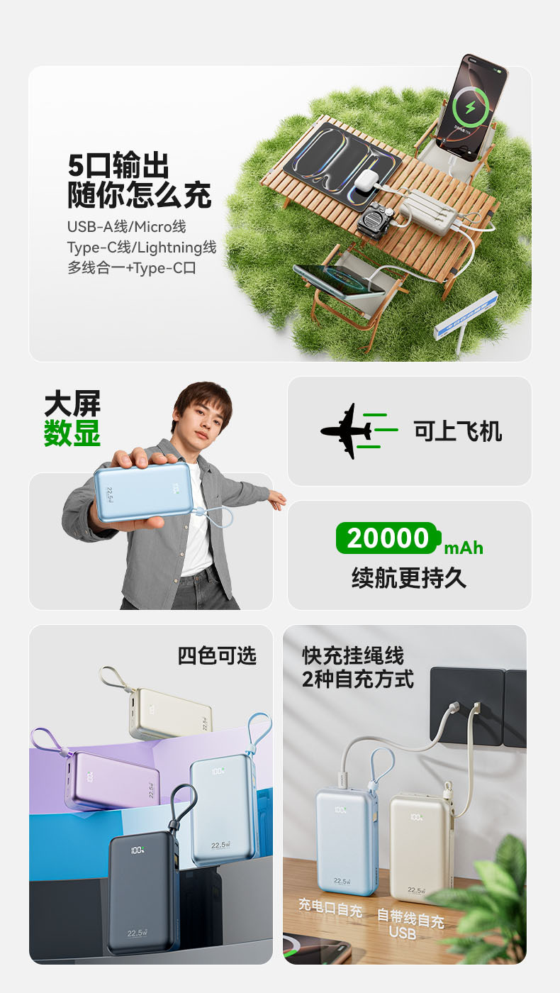 品胜3c充电宝20000毫安自带四线22.5W双向快充迷你便携移动电源
