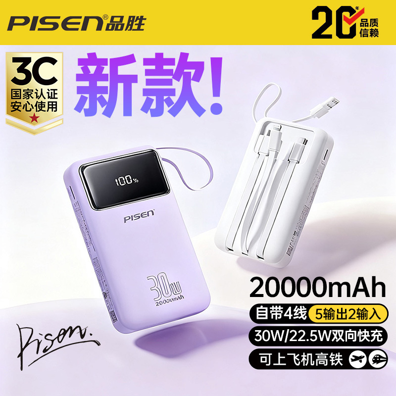 品胜充电宝3C认证自带线20000毫安双向快充移动电源适用苹果华为