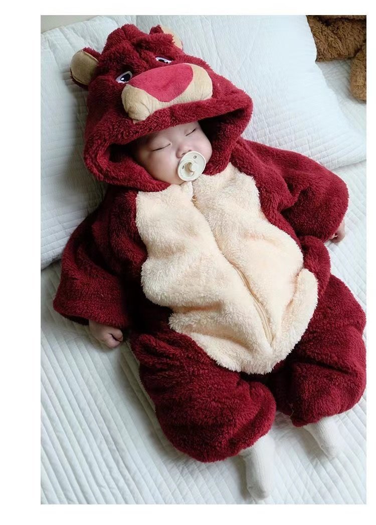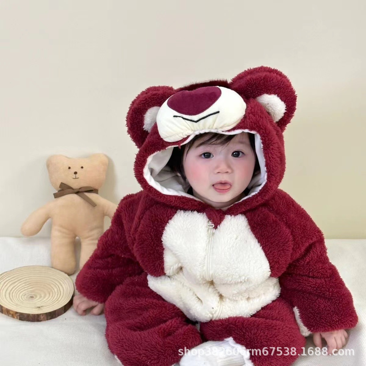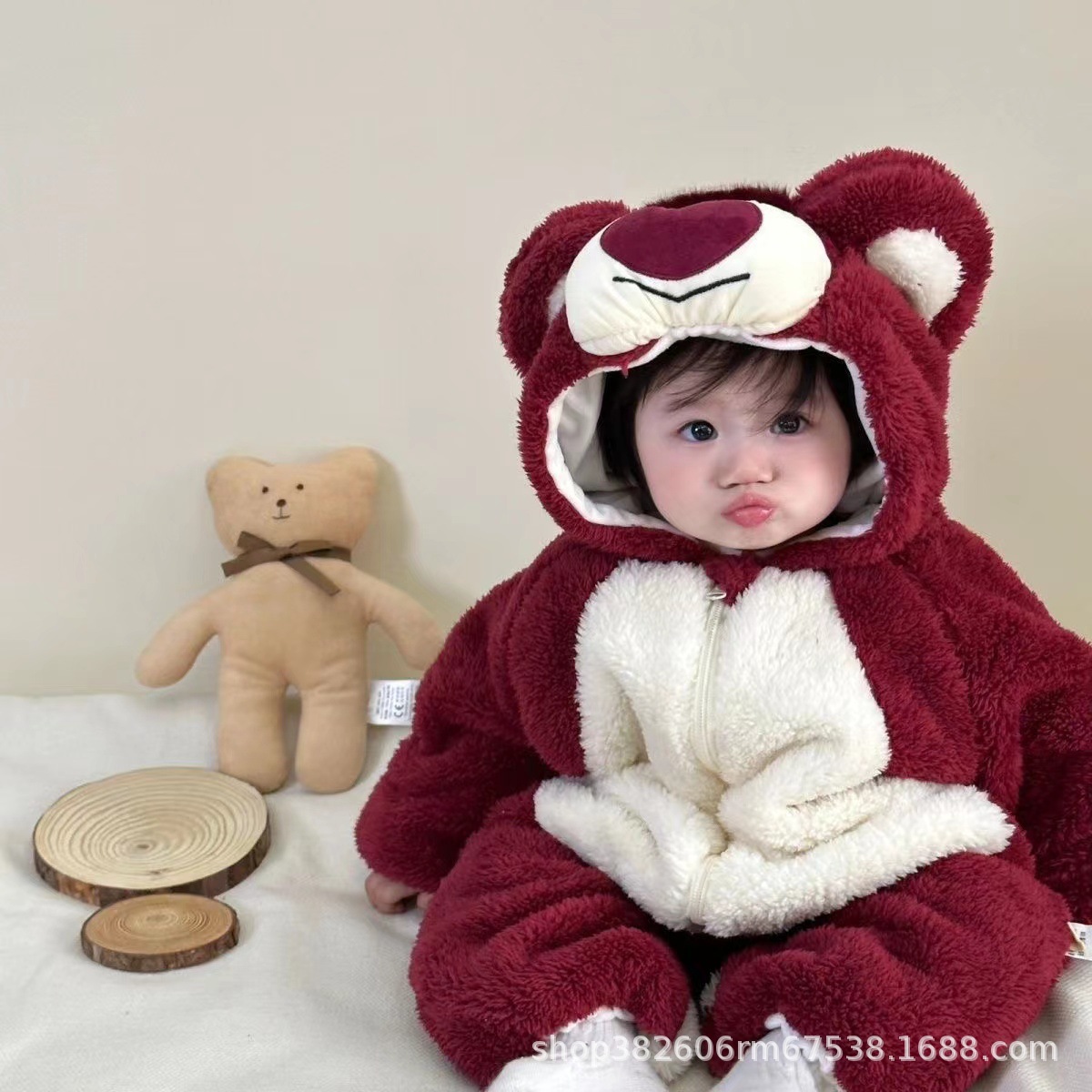 いちご熊服赤ちゃんが登る服秋冬ベルベット保温少女連体服赤ちゃんパジャマ男子家庭服