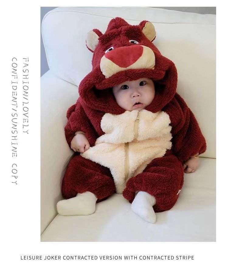赤ちゃんの冬タイプの厚い連体服の男の子と赤ちゃんのベルベットの厚い綿入れの服はとてもかわいいいちご熊が外出して服を登る