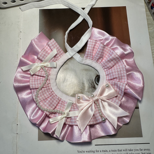 粉色格子蝴蝶结宠物蕾丝花边口水巾格子狗狗饰品猫咪围嘴法牛围巾