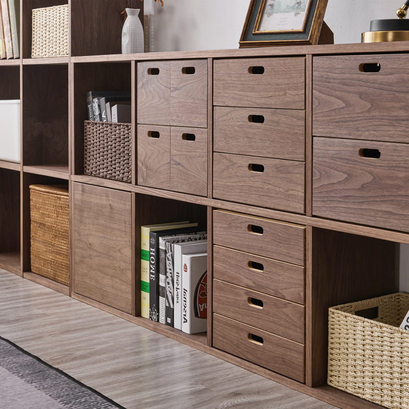 实木矮书柜胡桃木色格子柜家用客厅矮柜子储物柜靠墙落地一体书架