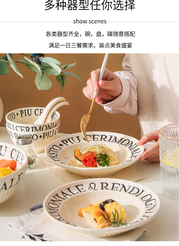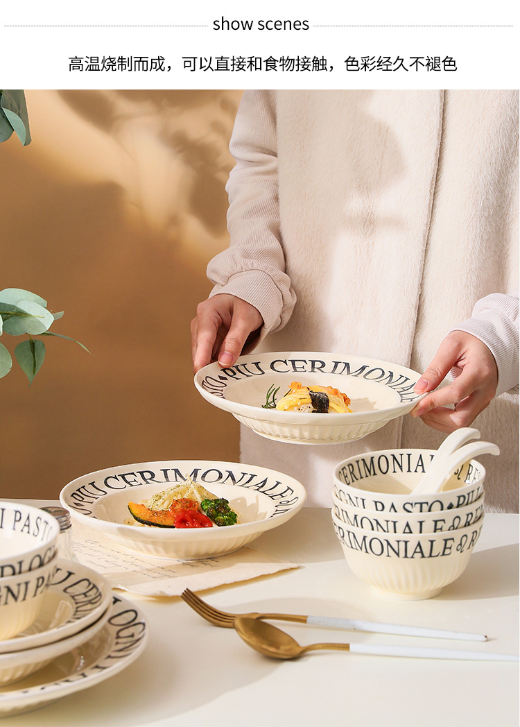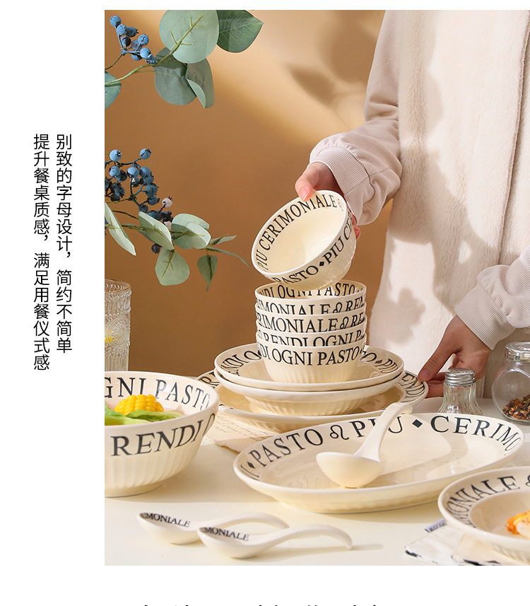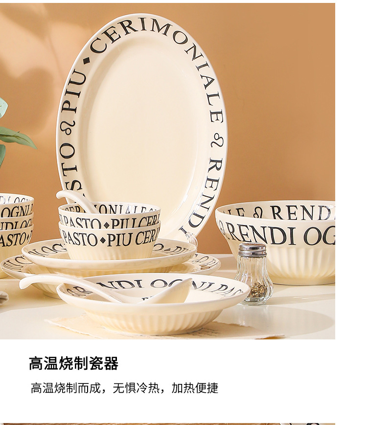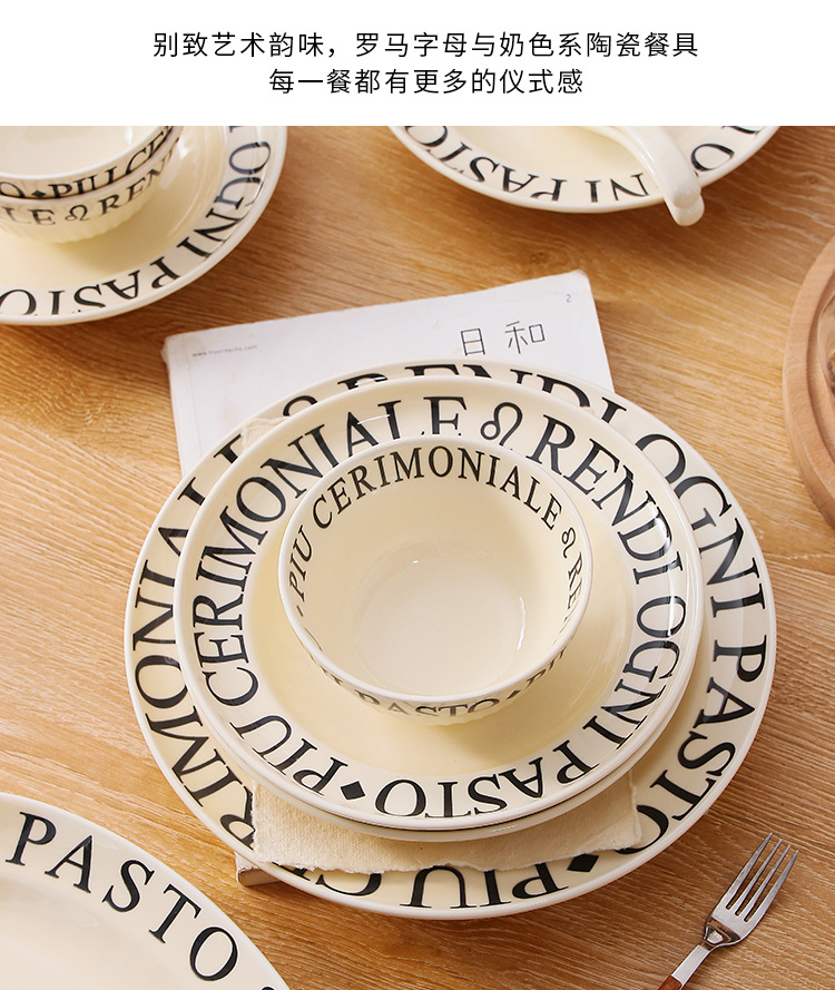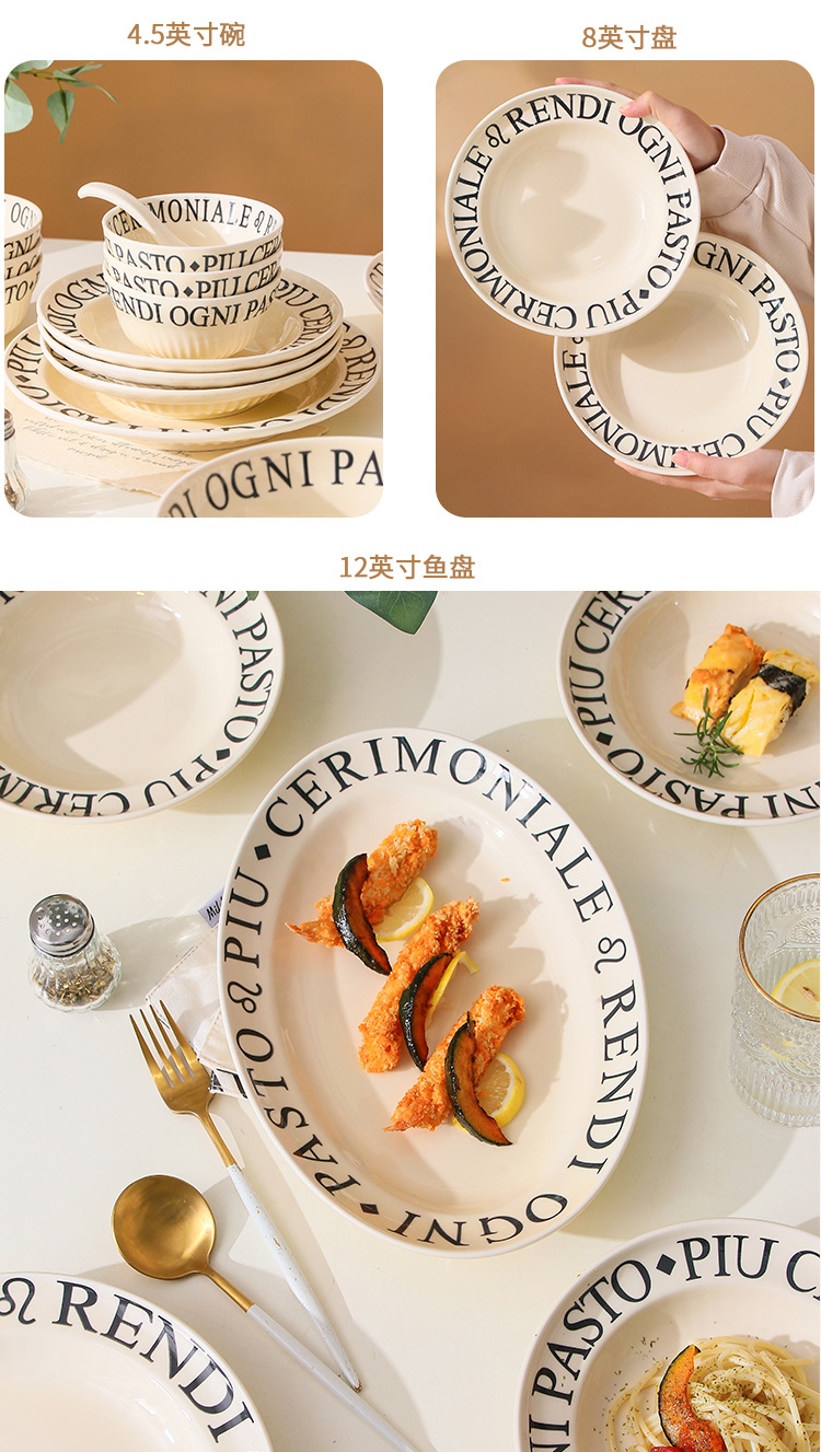 4.5インチライスボウル (ミルクイエロー文字),8インチスープボウル (ミルクイエロー文字),8インチ深皿 (ミルクイエロー文字),6インチの浅い皿 (ミルクイエロー文字),8インチの浅い皿 (ミルクイエロー文字),10インチの浅い皿 (ミルクイエロー文字),12インチ魚皿 (ミルクイエロー文字),調味料皿 (ミルクイエロー文字),スプーン (ミルクイエロー文字),大きなスプーン (ミルクイエロー文字)