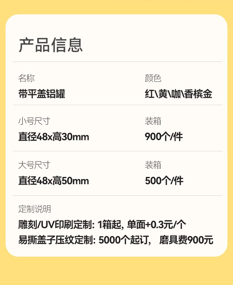 仕様とモデル 平蓋付きアルミ缶 3cm丨赤 茶葉なし,平蓋付きアルミ缶 3cm丨ゴールドカラー、茶葉なし,平蓋付きアルミ缶 3cm丨茶色;茶葉なし,平蓋付きアルミ缶 3cm丨シャンパンゴールド 茶葉なし,平蓋付きアルミ缶 5cm丨赤 茶葉なし,平蓋付きアルミ缶 5cm丨ゴールドカラー 茶葉なし,平蓋付きアルミ缶 5cm丨茶色;茶葉なし,平蓋付きアルミ缶 5cm丨シャンパンゴールド 茶葉なし