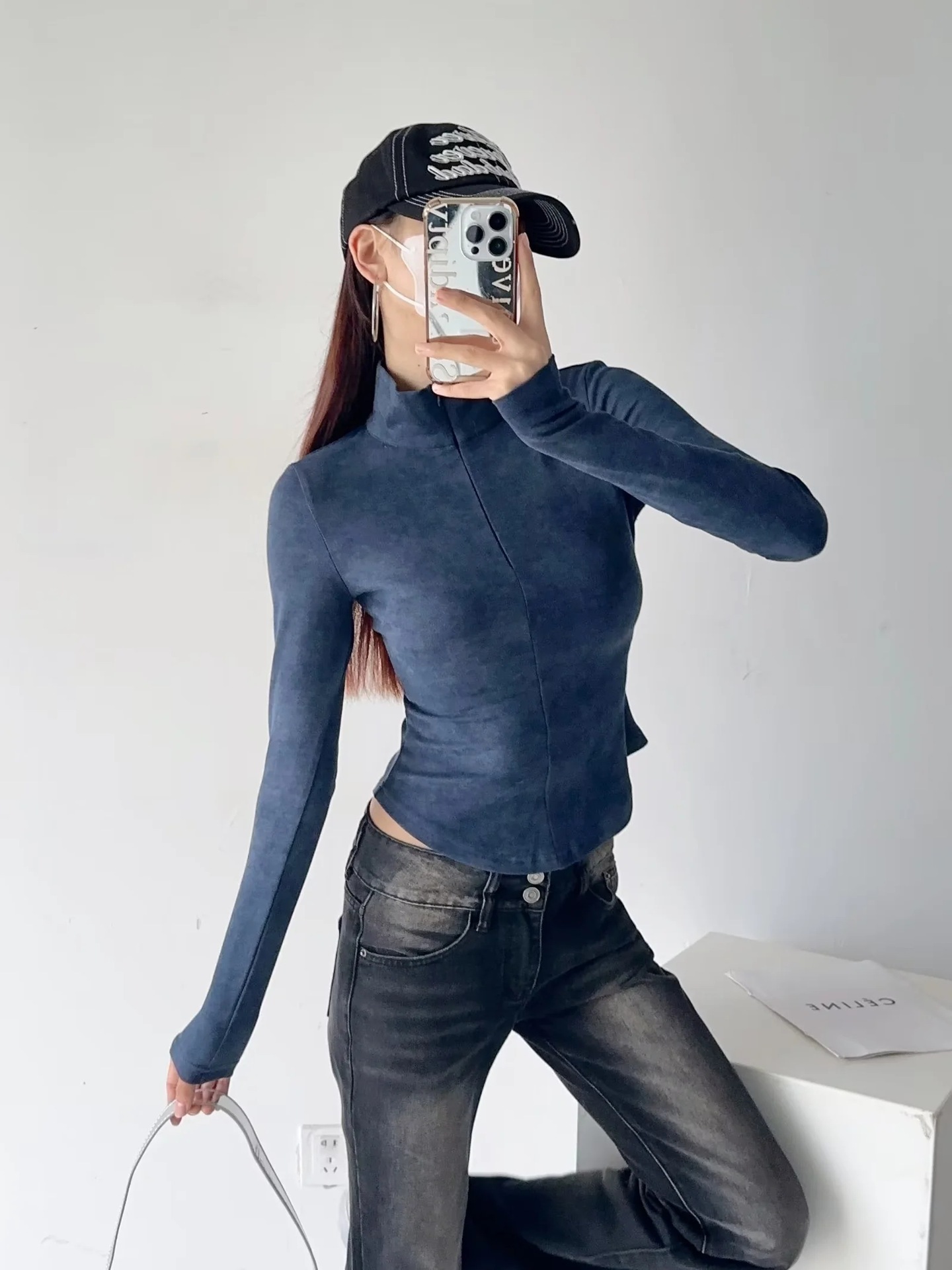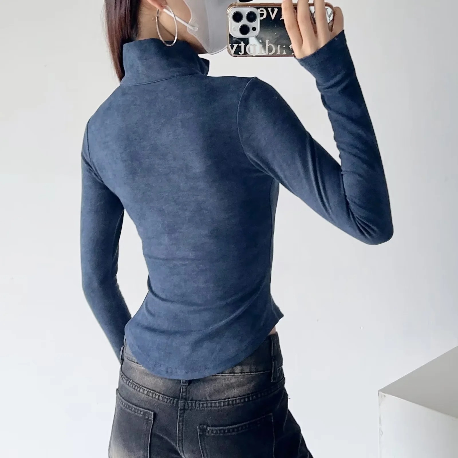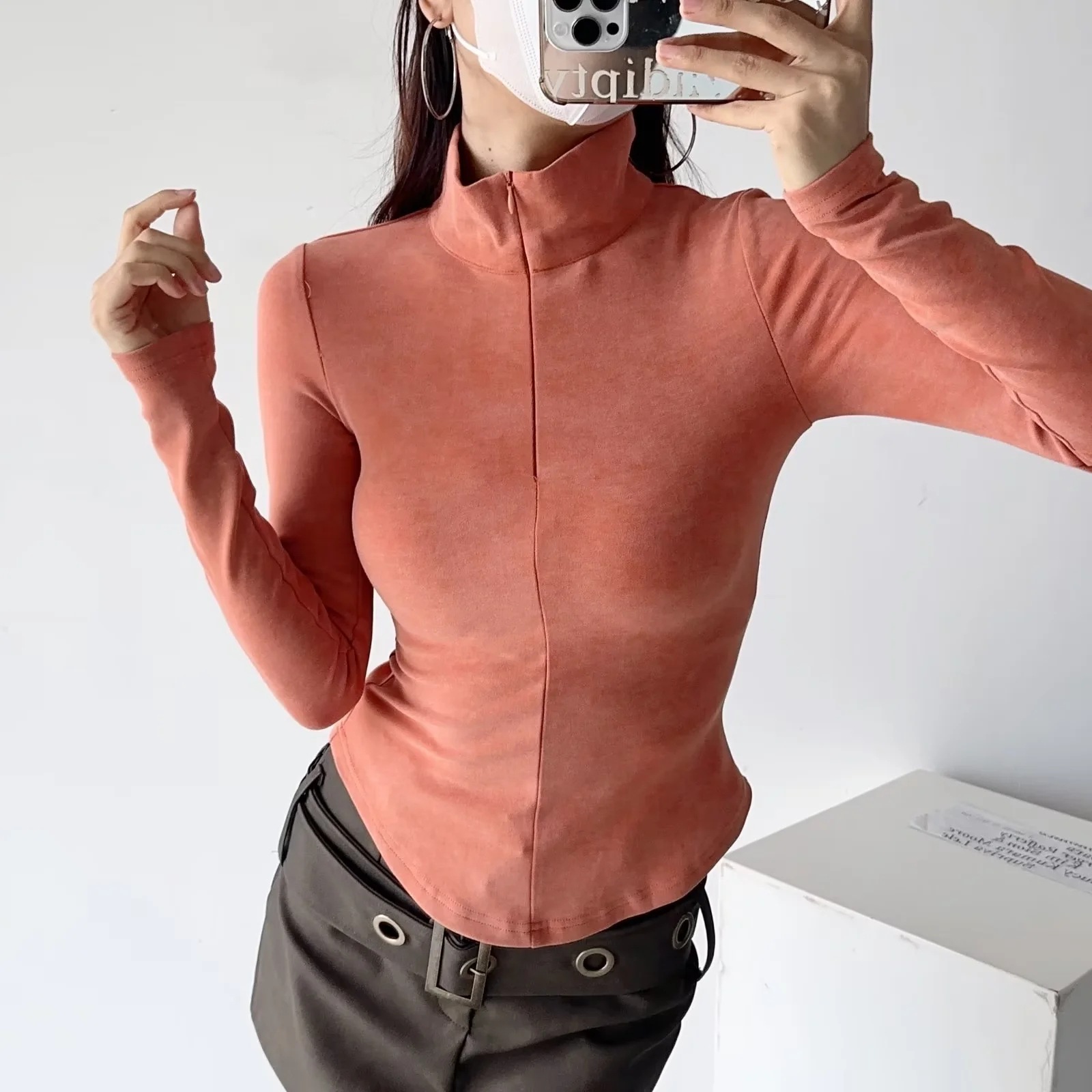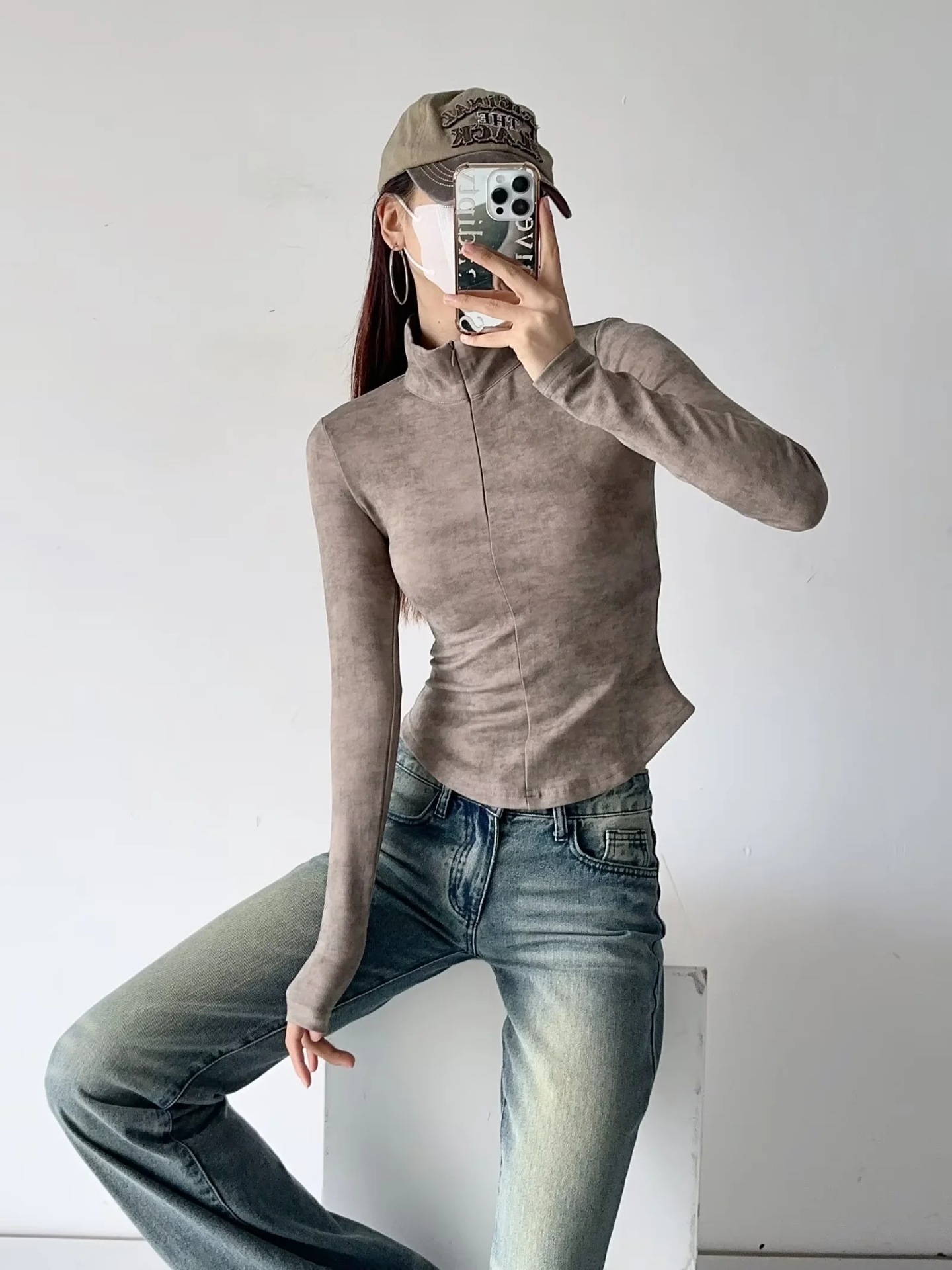 ギャルの高襟の半ファスナーは毛を磨いて長袖のtシャツを染めます。