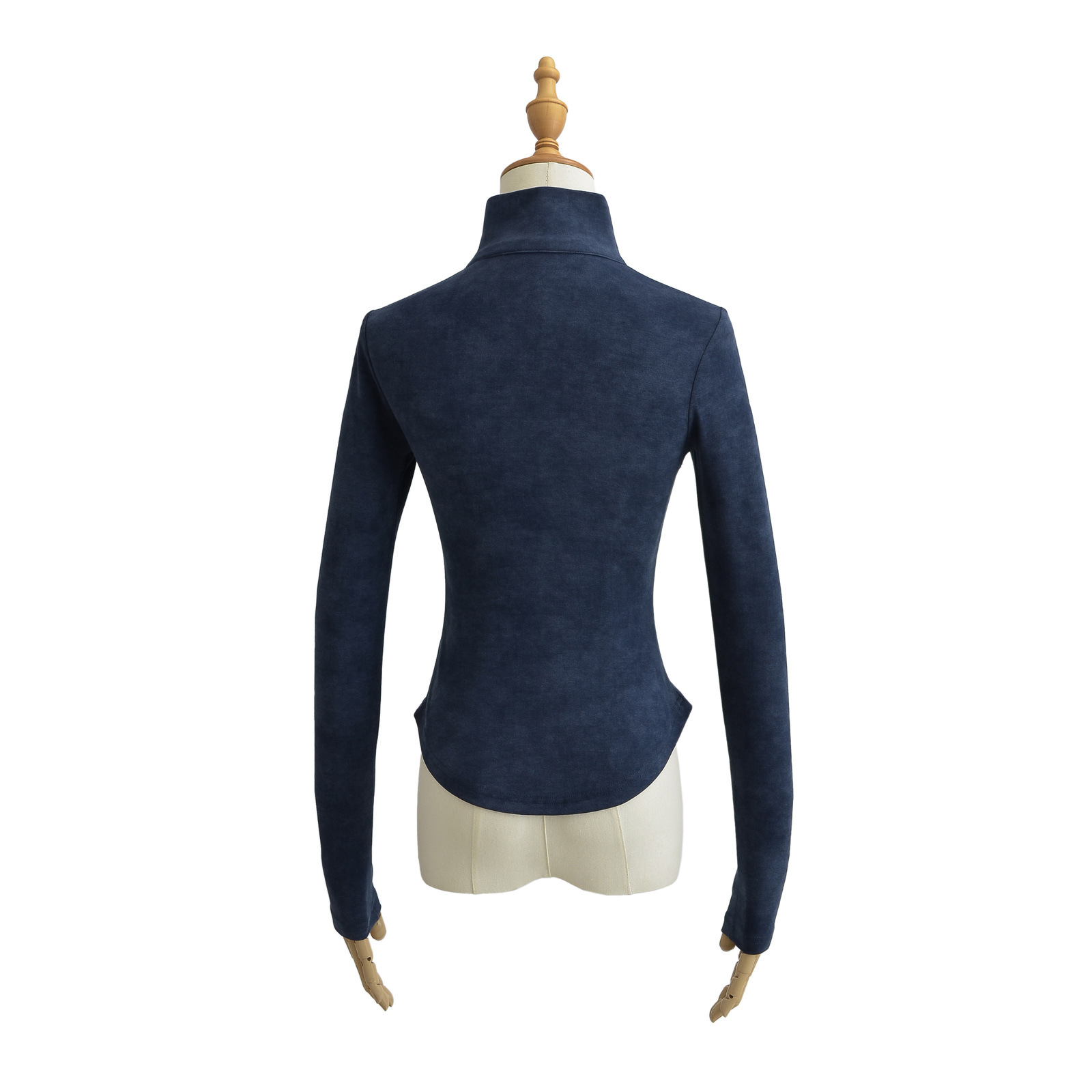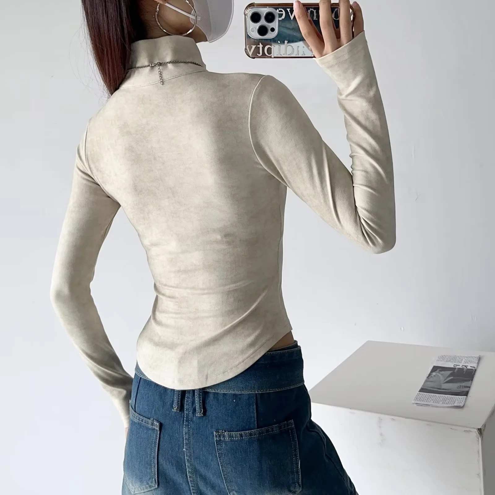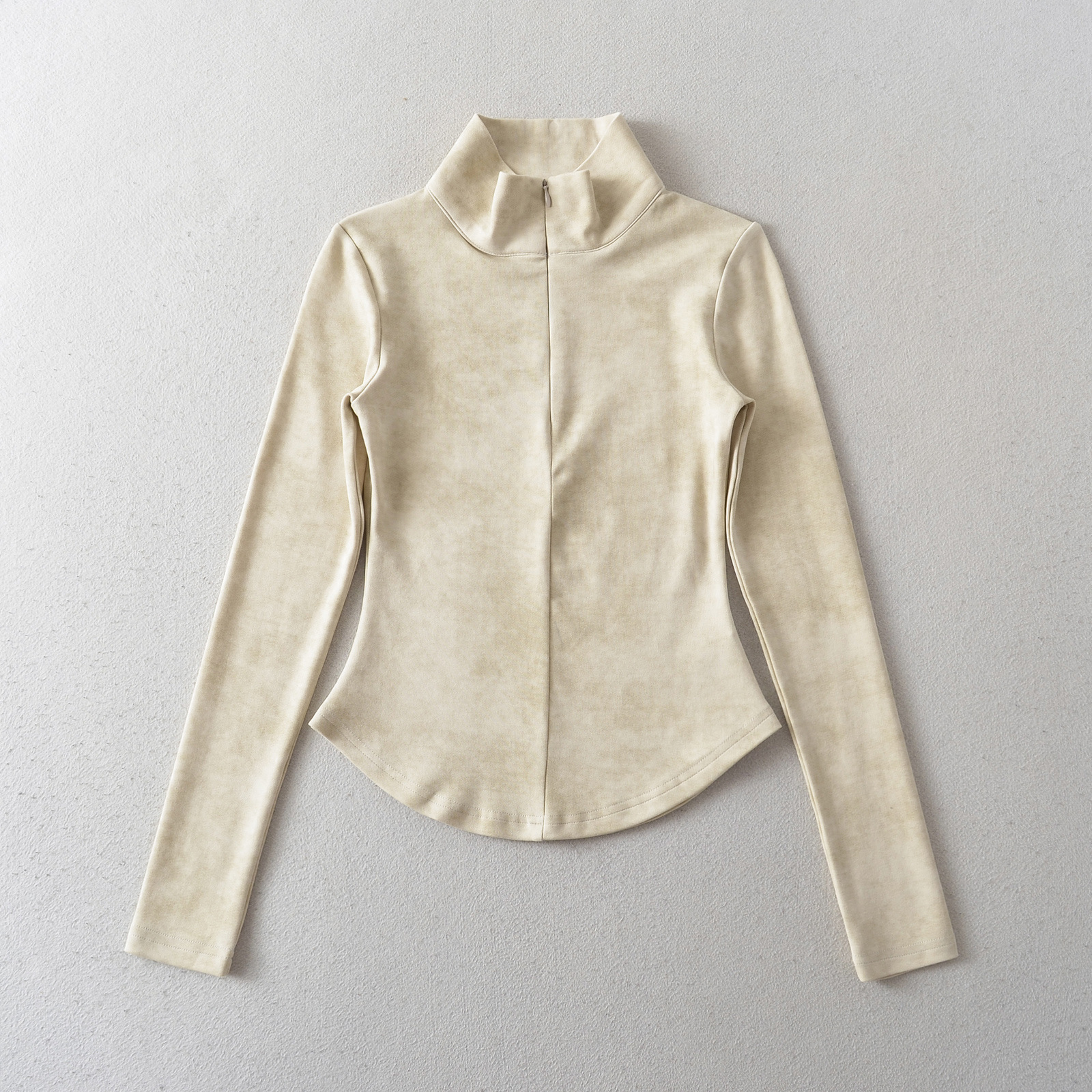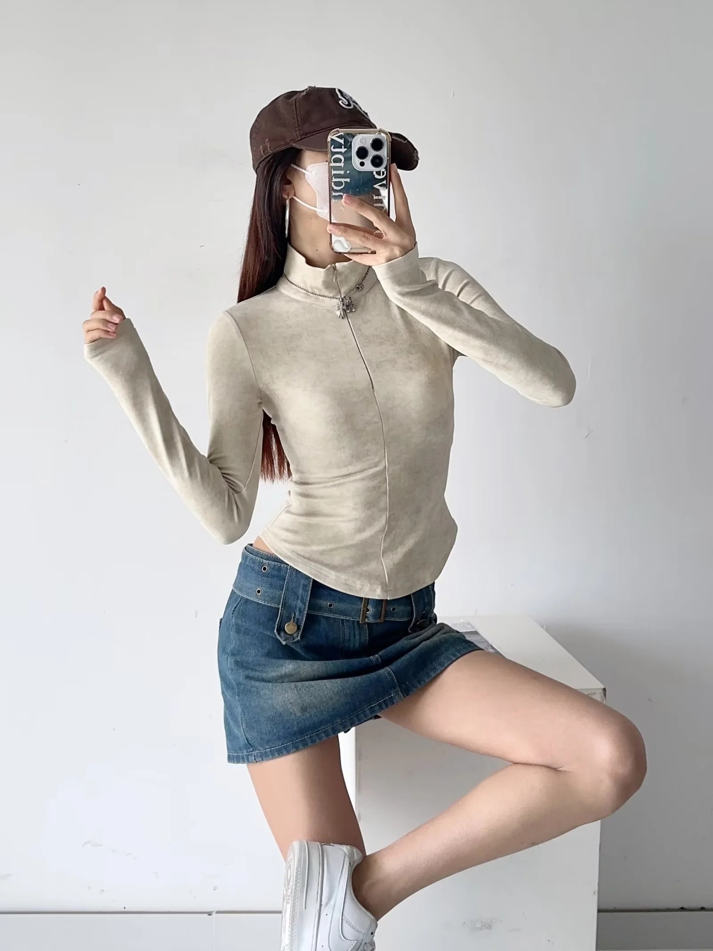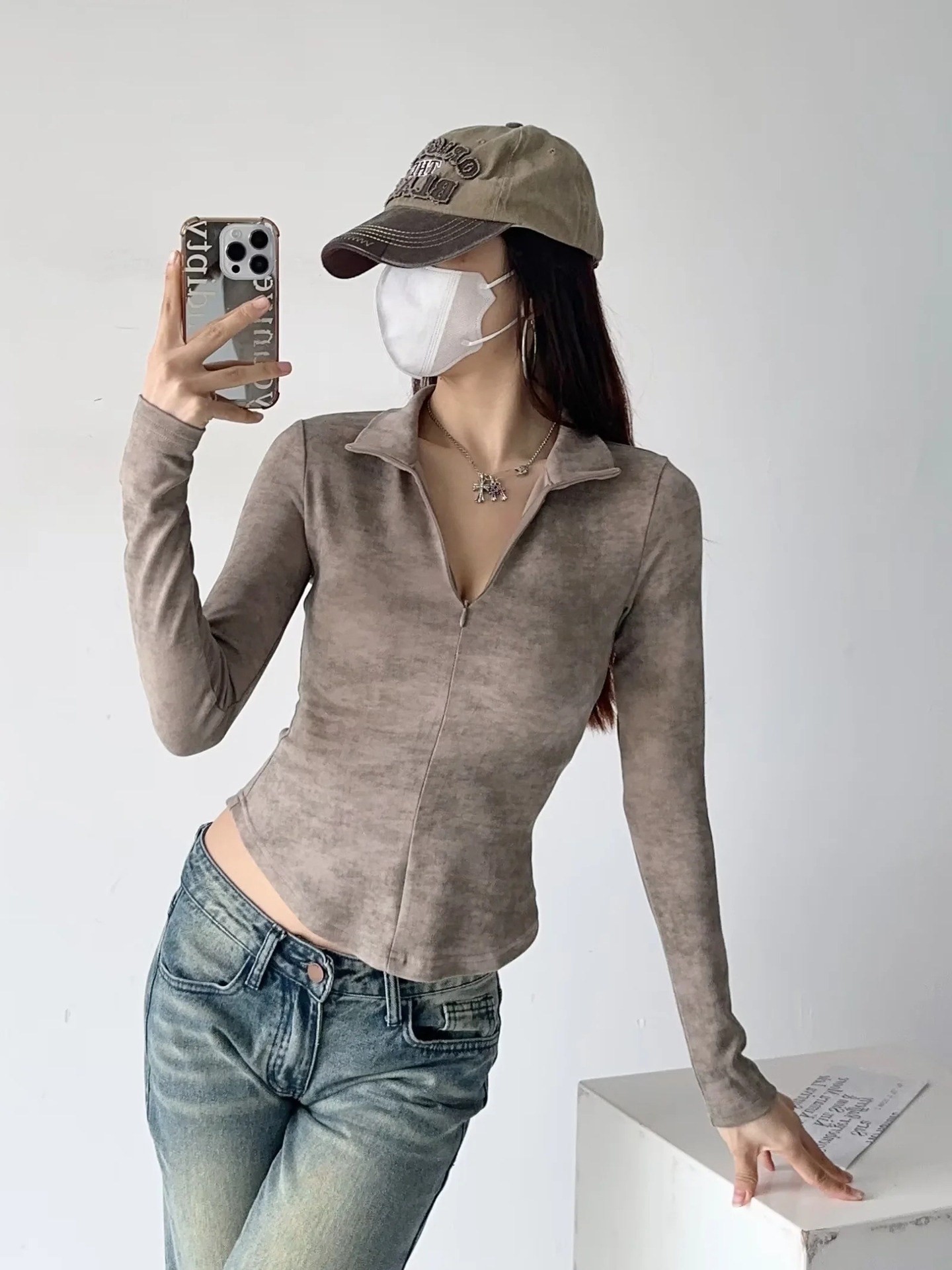 ギャルの高襟の半ファスナーは毛を磨いて長袖のtシャツを染めます。