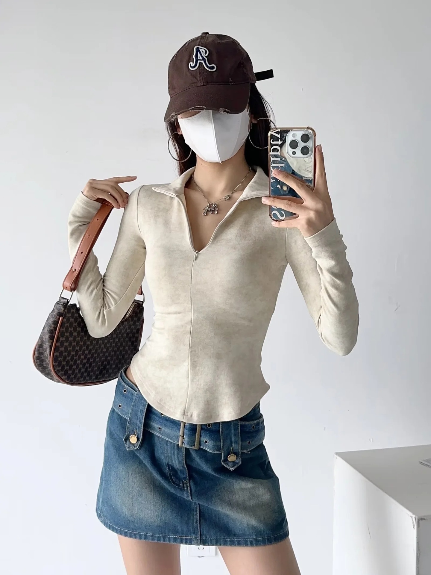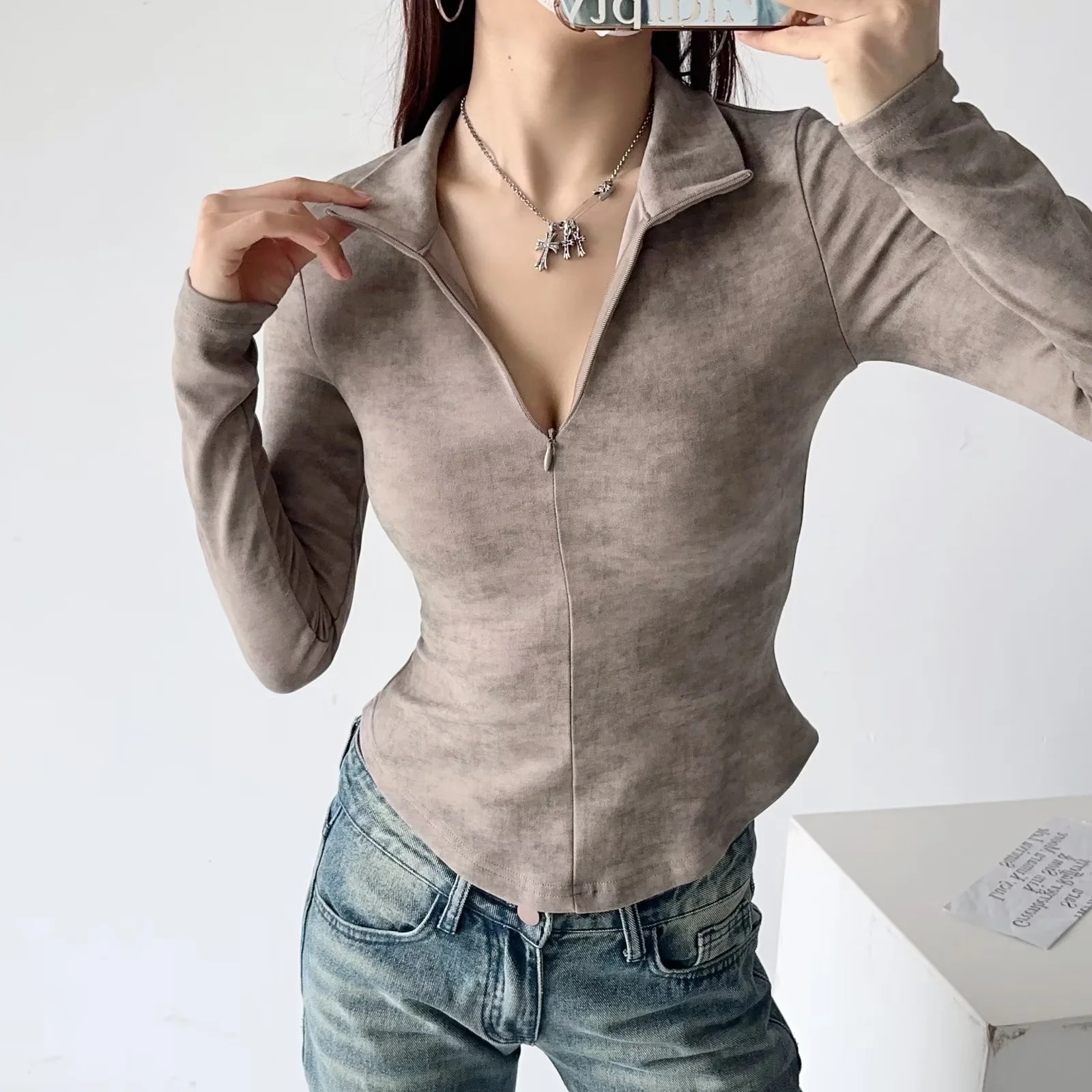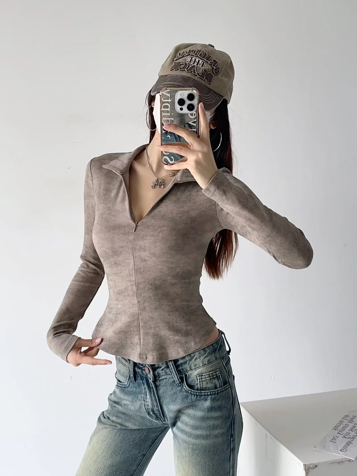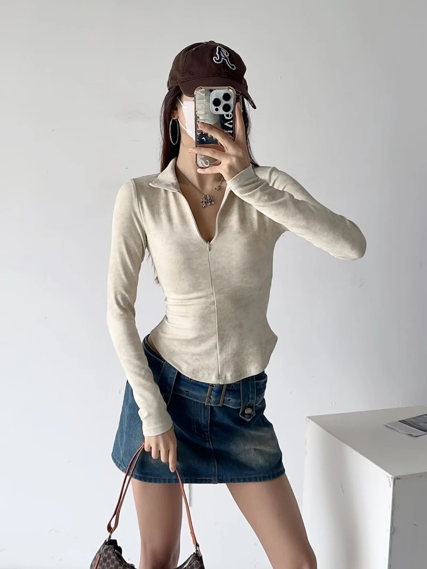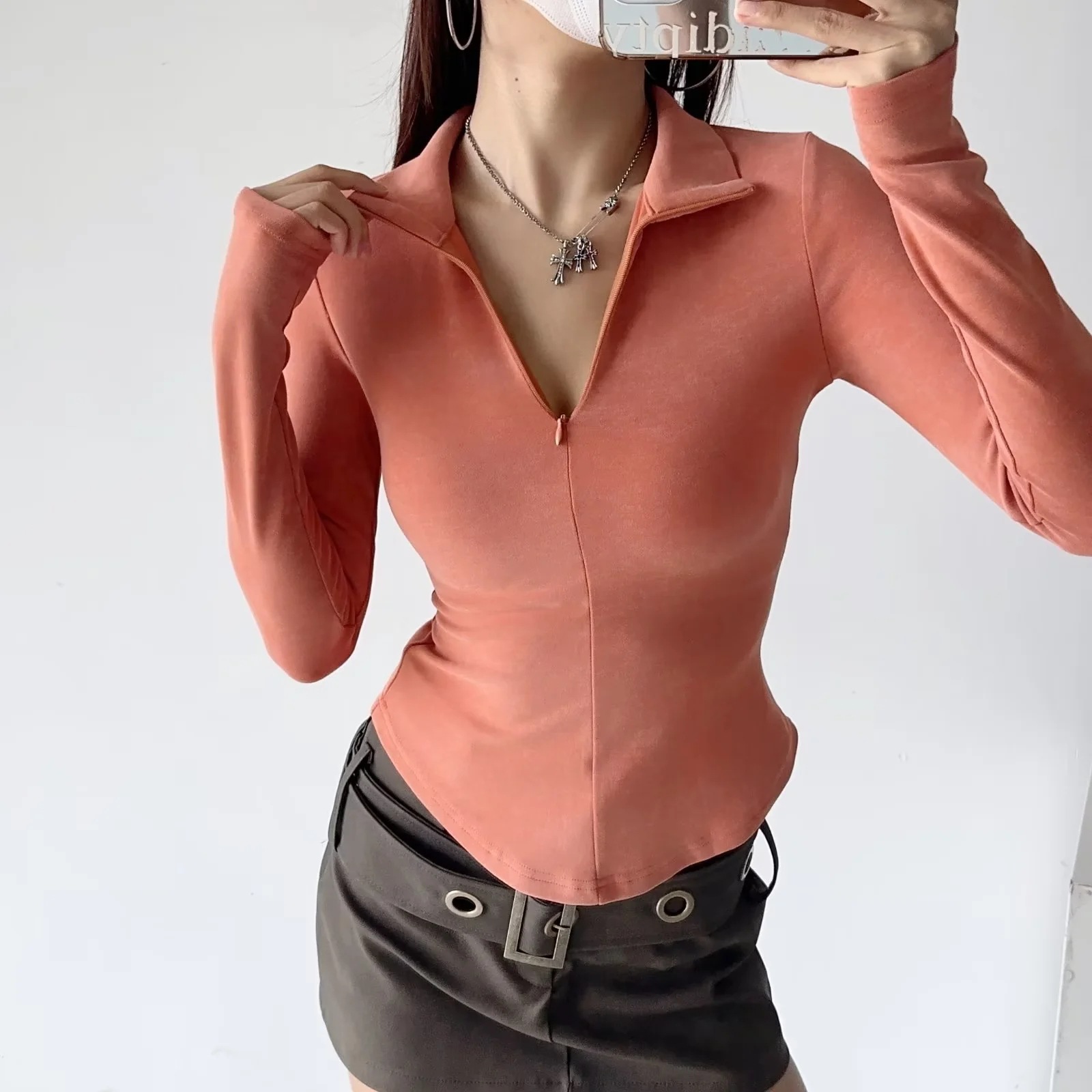 ギャルの高襟の半ファスナーは毛を磨いて長袖のtシャツを染めます。