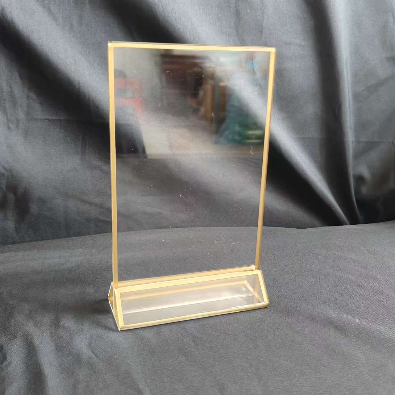 亚克力金边三角台卡展示双面相框直接夹入彩页可更换画面,高清丝印一体成型,如需定制,请联系在线客服,谢谢!