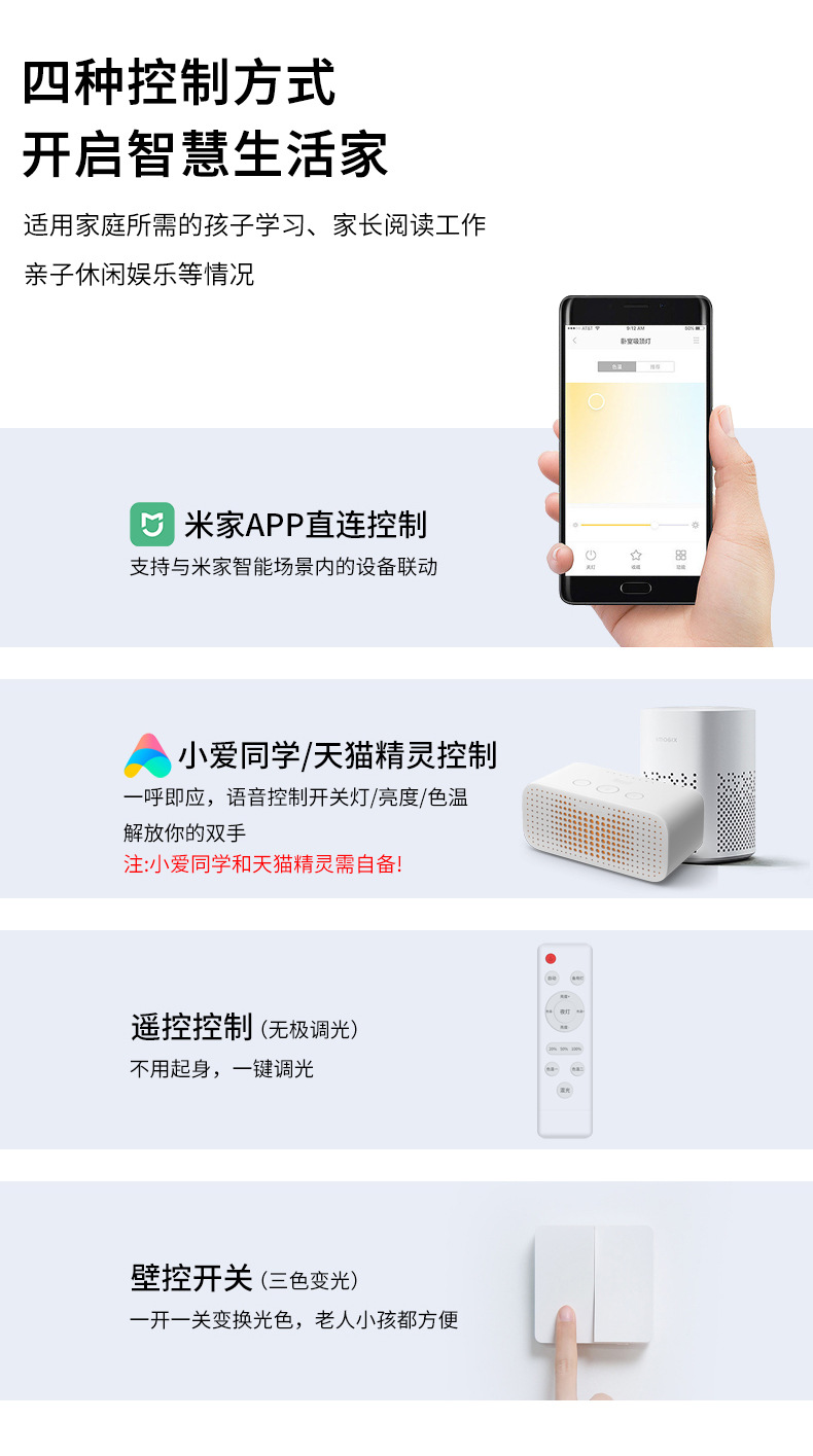 3色の光の変化,無段階調光(リモコン付),Tmall Elf (Wiji リモコン + APP + 音声),Mijia Smart (Wiji リモコン + APP + 音声)