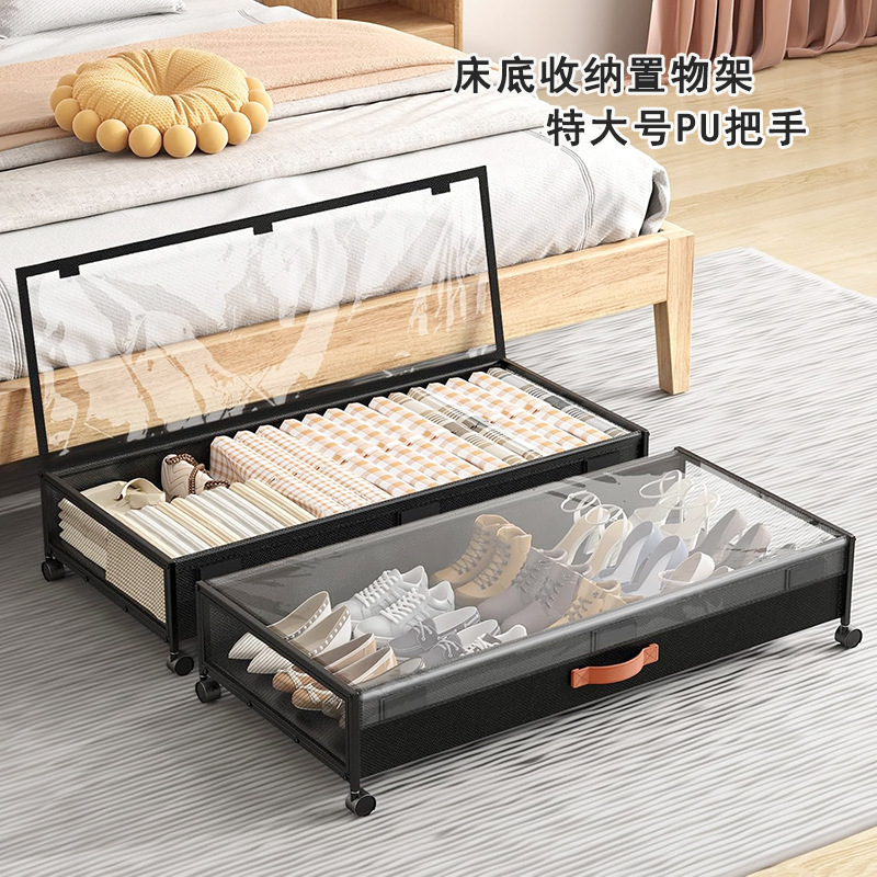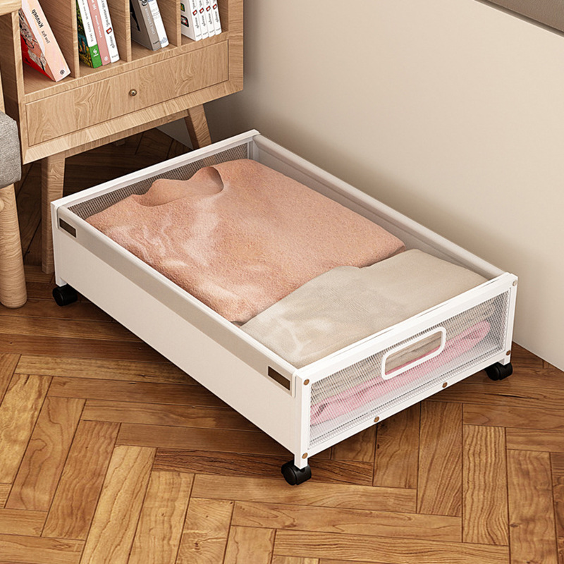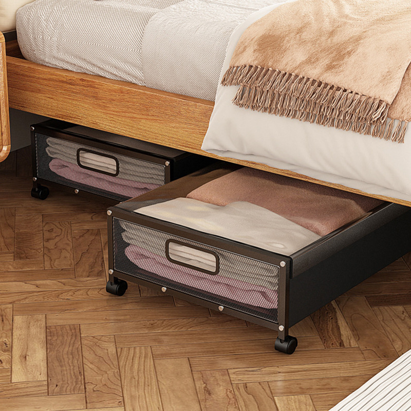ベッド下鉄製防塵収納ボックス移動式プーリー付きベッド底隙間整理棚衣類靴収納ボックス