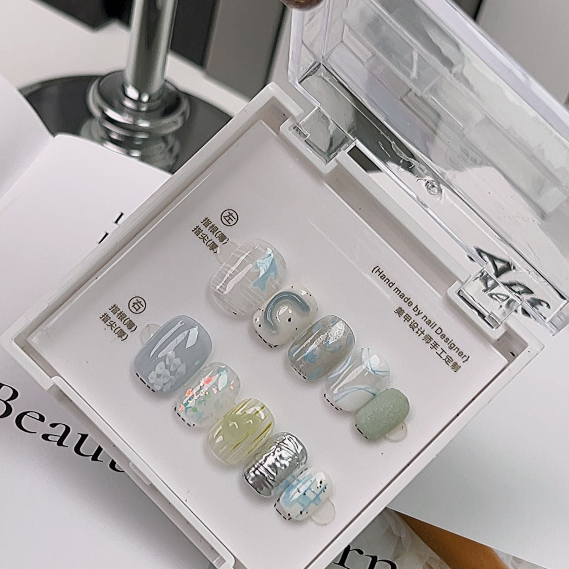 純手作りウェアラブルネイル、高級光沢のある天然マザーオブパール、手作りマニキュア、ショートスタイル、春夏の甘くてクールなネイルステッカー