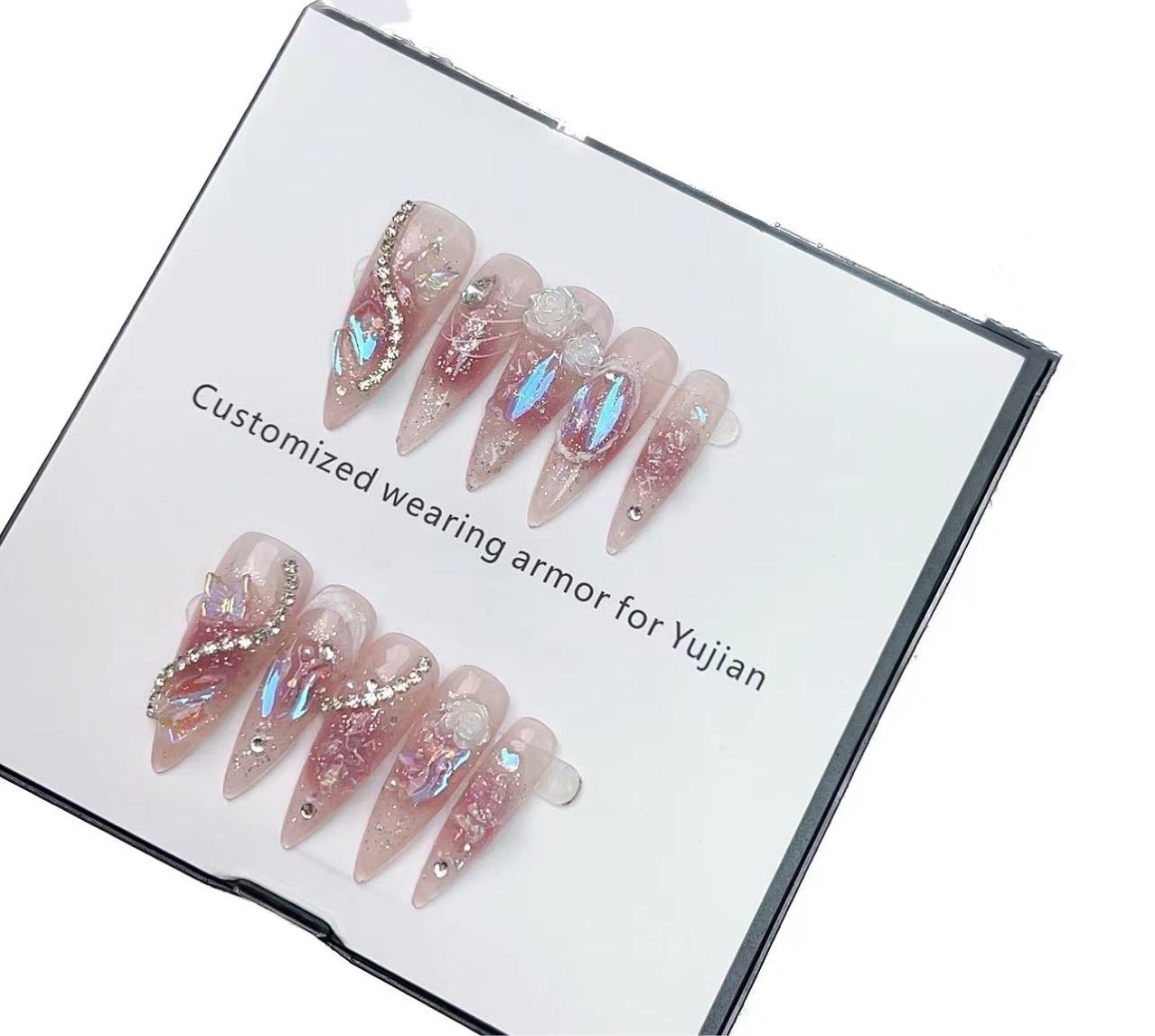 純粋な手作りのウェアラブルネイル卸売ライト高級妖精スタイル手で絞った花びら手描きマニキュアデイリーショートスクエアとラウンドネイルタイプ