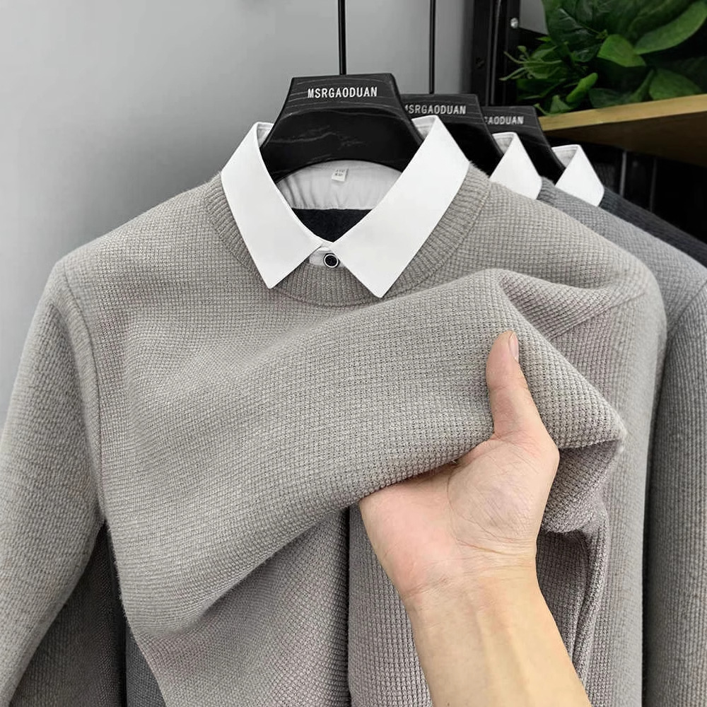 冬のベルベットの丸首の偽のシャツの襟のセーターの男性の秋のファッションのカジュアルな韓国の長袖の普通のニット