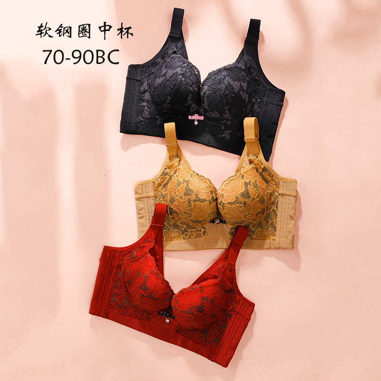 新款软钢圈精油杯小胸内衣中杯聚拢上托侧收副乳排扣大胸显小薄杯