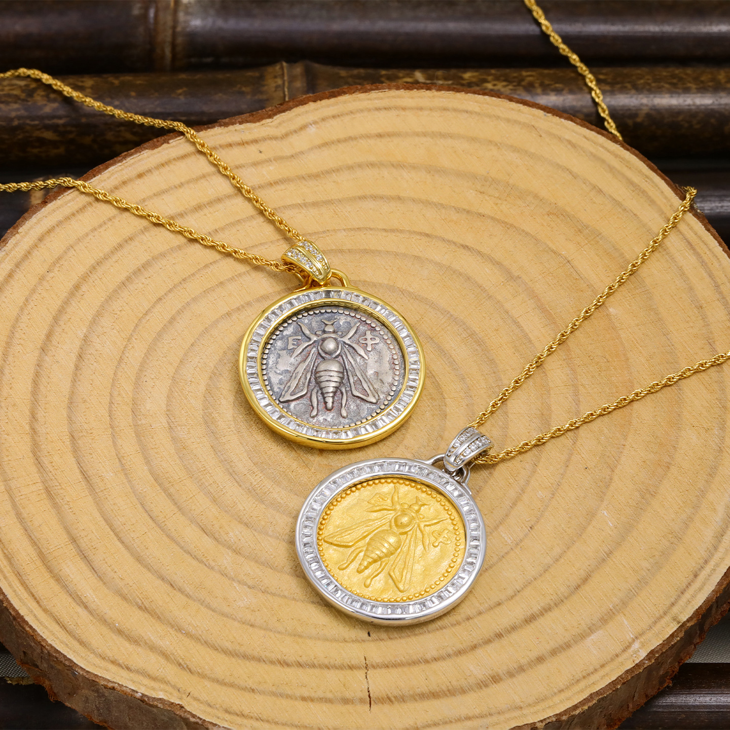 复古风s925纯银精工浮雕古币蜜蜂吊坠女秋冬款装饰搭配项链毛衣链