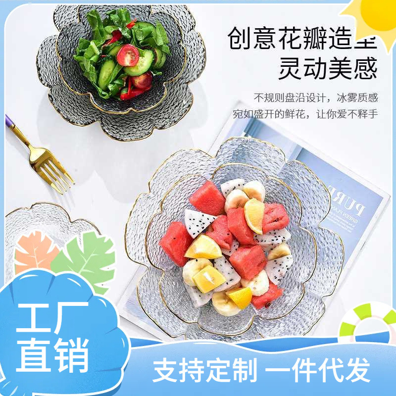 クローバー花びら皿和風ハンマー金辺ガラスボウル家庭用食器insクリエイティブサラダボウル果物皿セット
