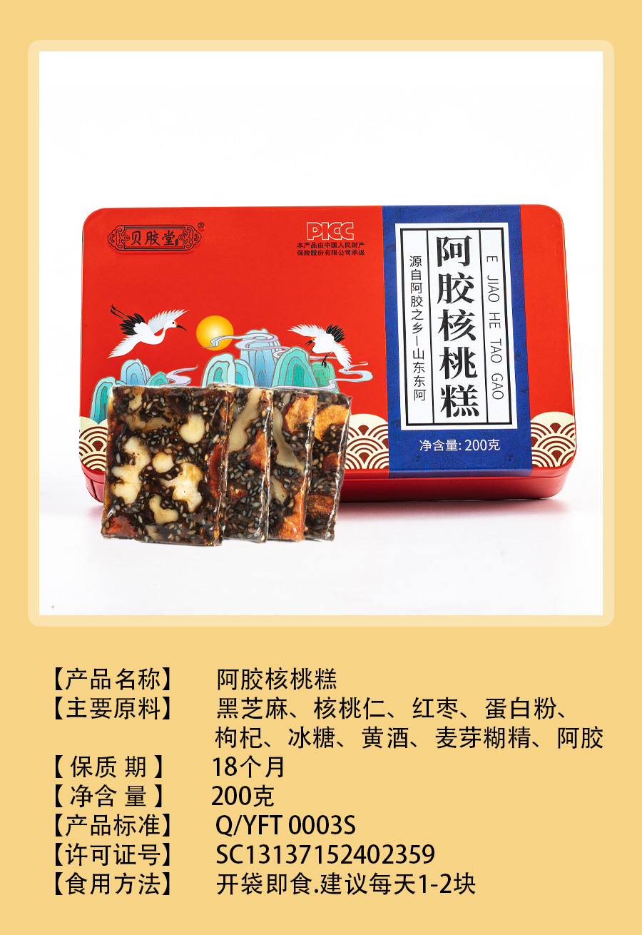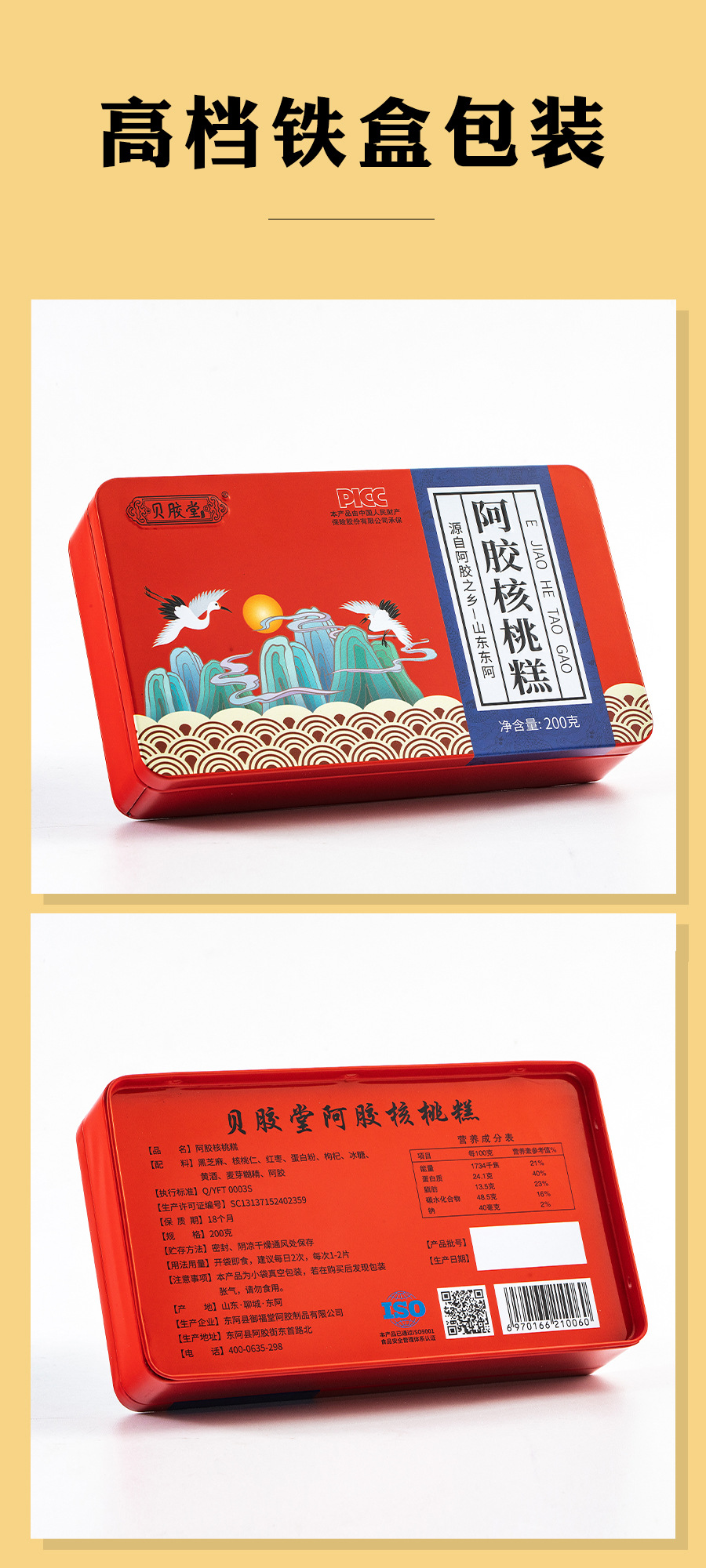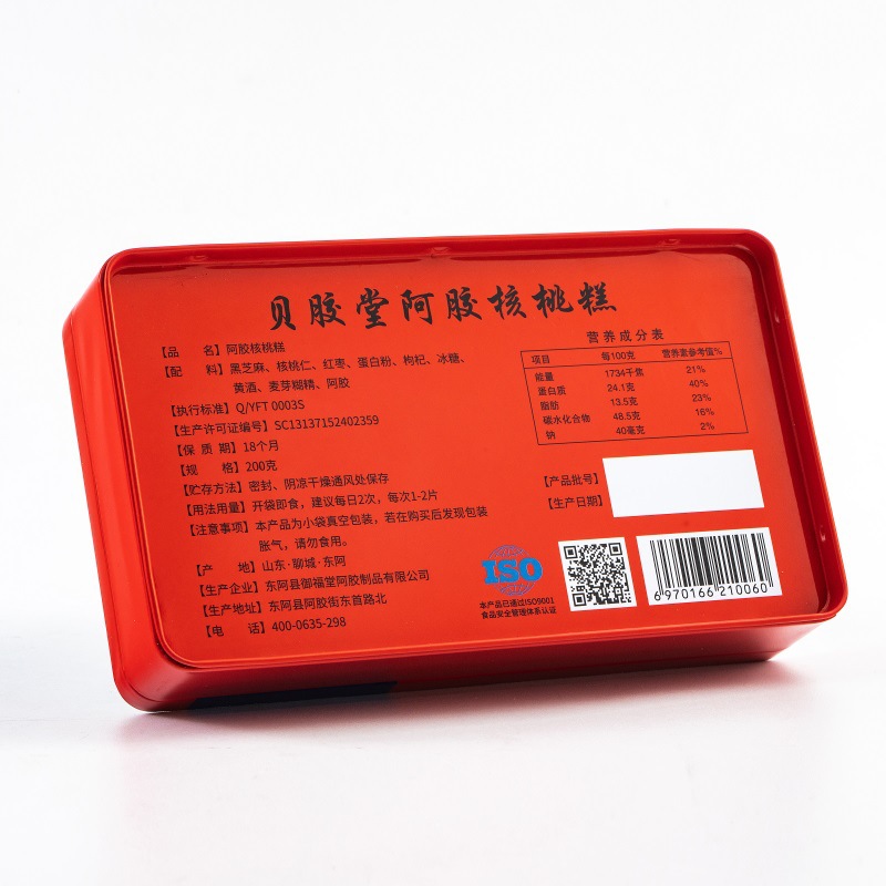 【販売】山東省東阿市伝統滋養品 阿膠核桃餅 200g 鉄箱入り 女性向け即食阿膠餅
