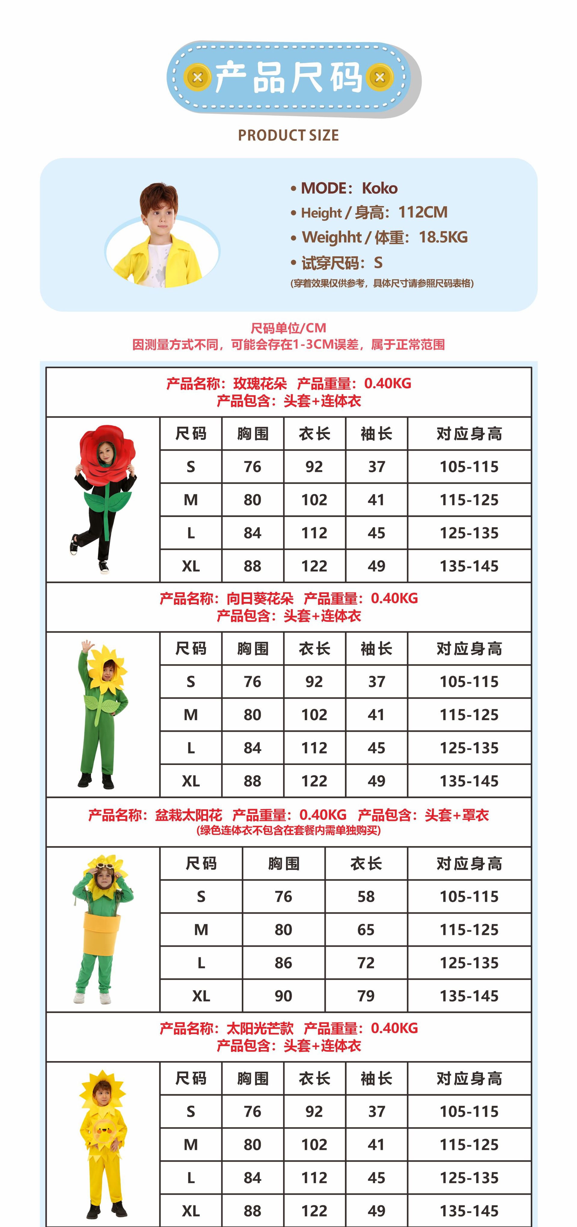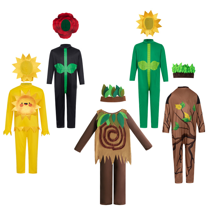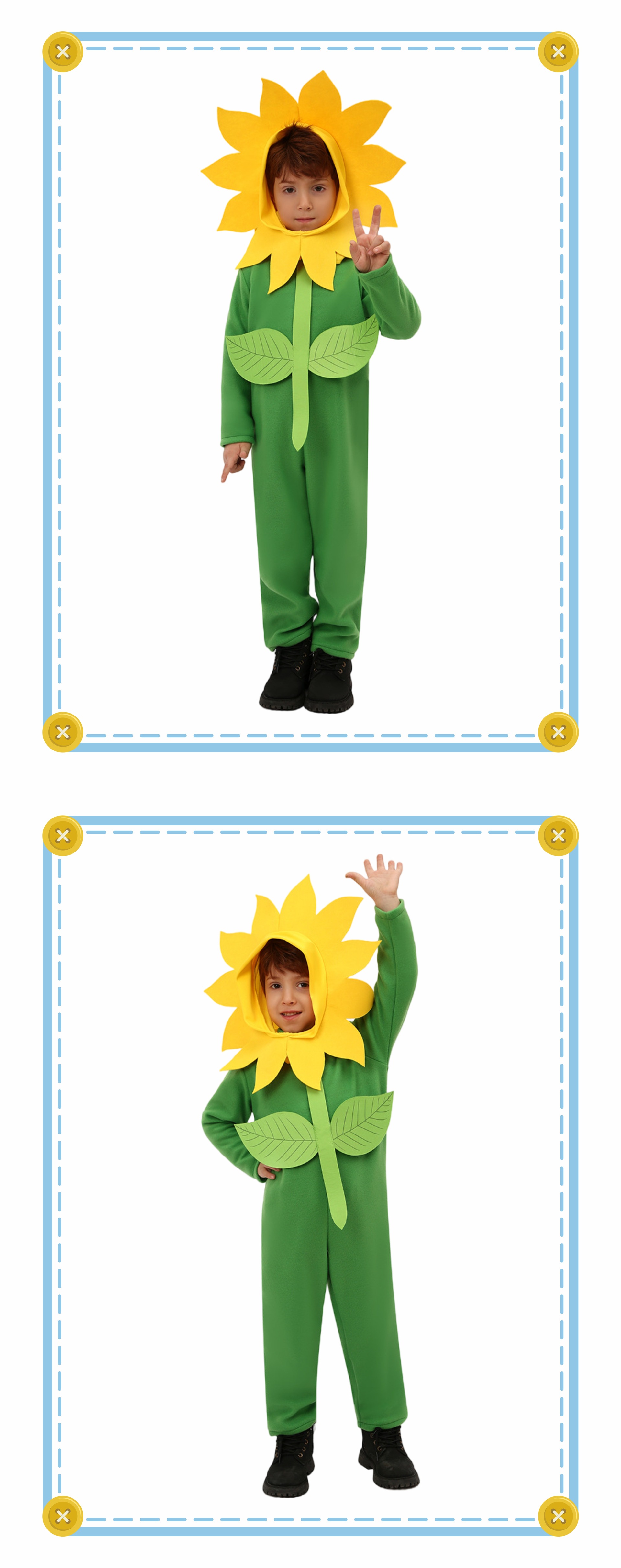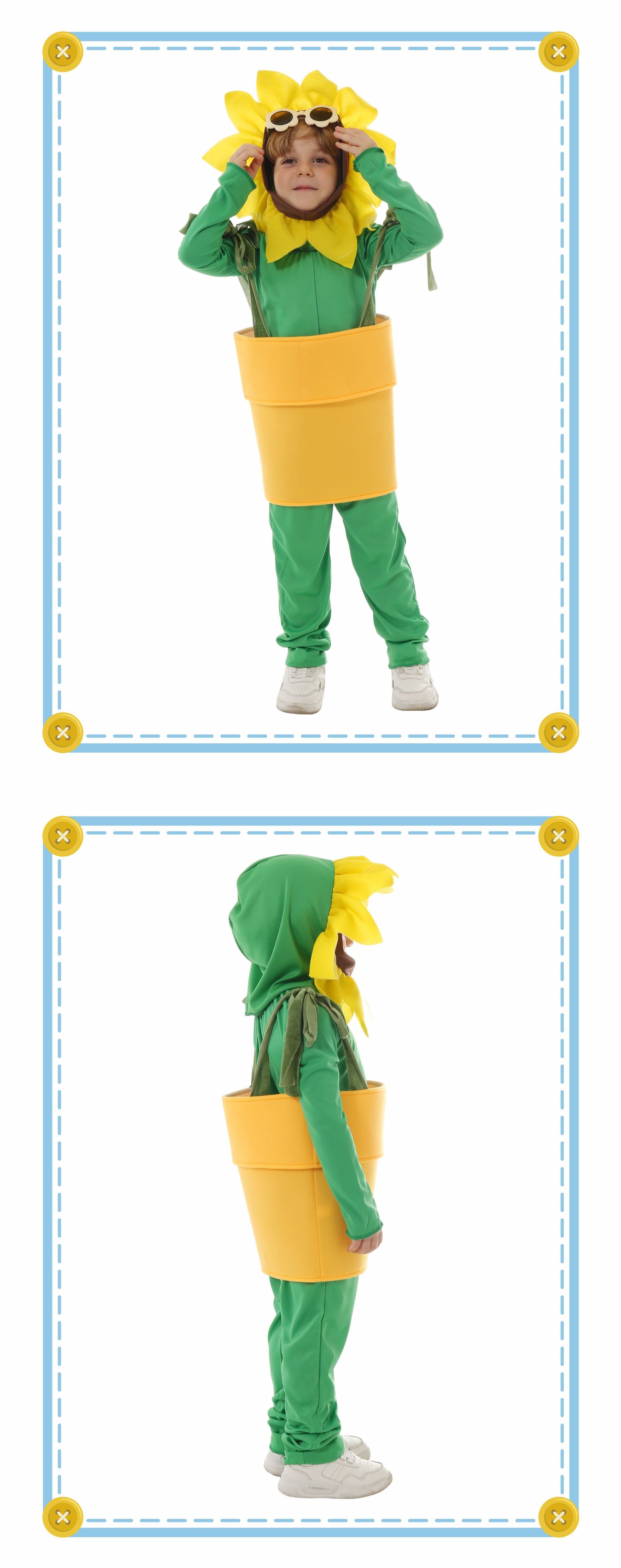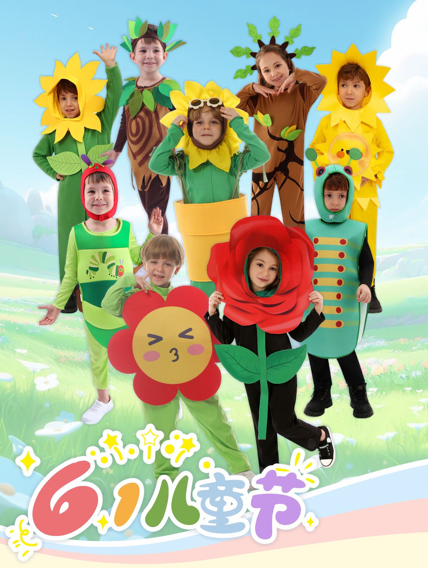 ひまわり植物のコスチューム、子供用大型ツリー演出、男の子と女の子のひまわりとバラのコスチューム、舞台衣装